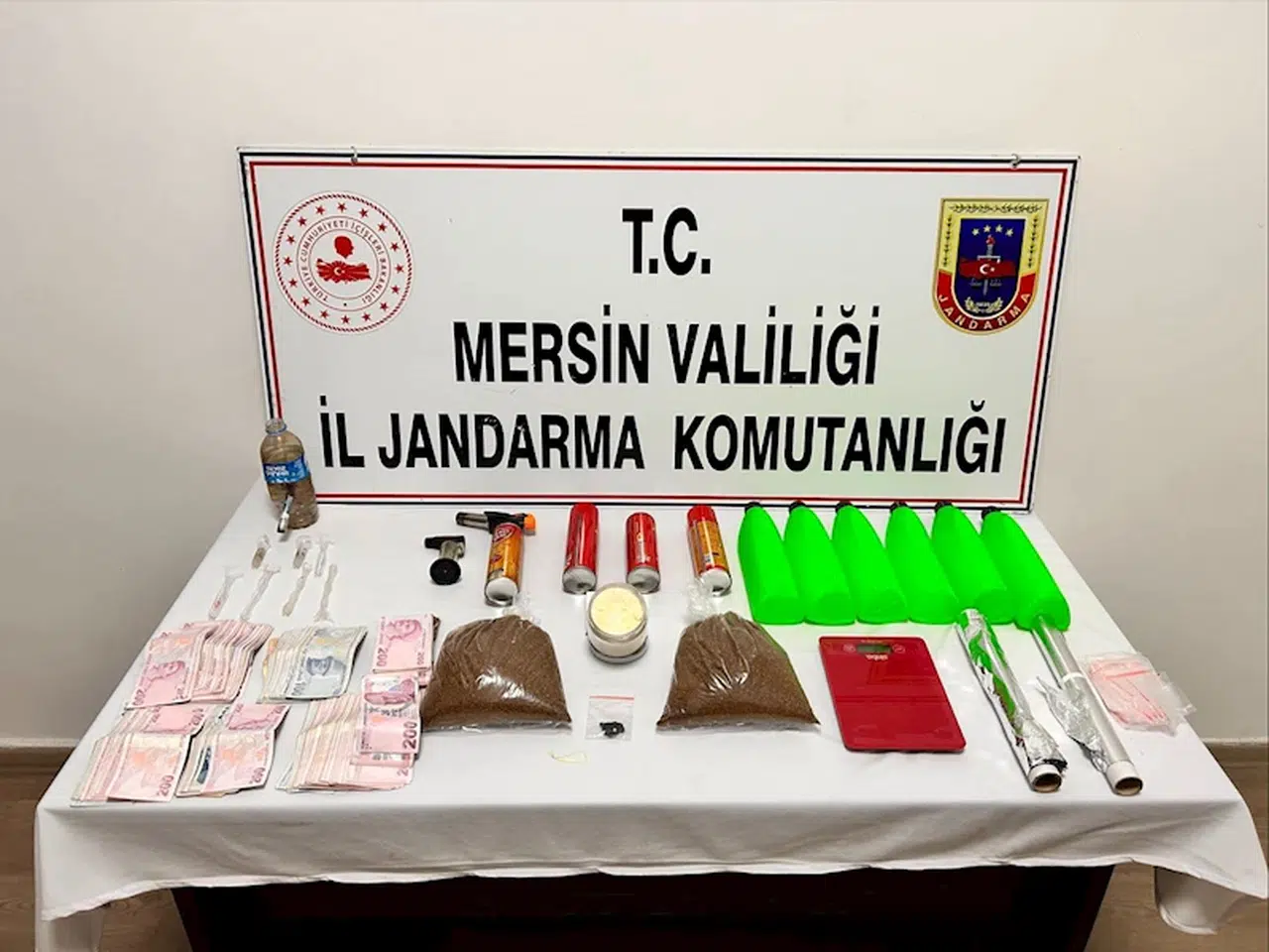 İl Jandarma Komutanlığı ekipleri merkez Akdeniz ilçesinde 2 şüphelinin uyuşturucu madde ticareti yaptığını tespit etti. Şüphelileri takibe alan Jandarma düzenlediği operasyon ile gözaltına aldı. Yapılan aramalarda 2 kilo 930 gram bonzai, 87 gram metamfetamin, 2 cep telefonu, 6 uyuşturucu madde kullanma aparatı, 6 litre aseton, 4 çakmak gazı ile 44 bin 500 TL nakit para ele geçirildi. Jandarmadaki işlemlerinin ardından adliyeye sevk edilen 2 şüpheli çıkarıldığı nöbetçi mahkemede tutuklandı. (DHA)