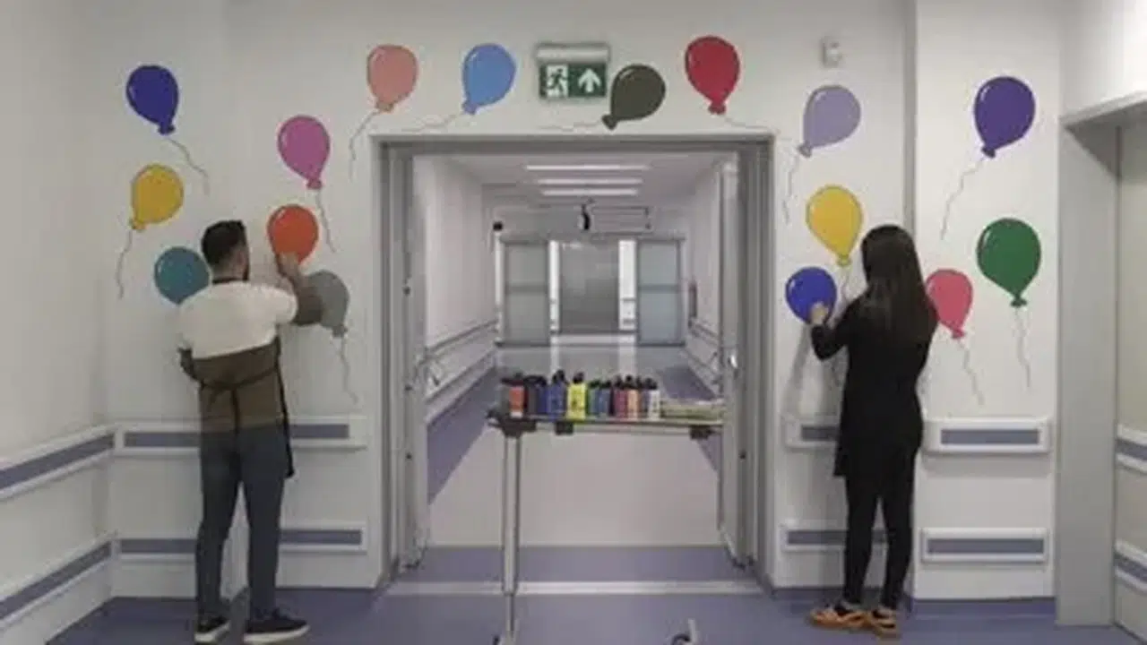 Hastane yönetimiyle görüşen hemşire çift, olumlu yanıtın ardından çocuk polikliniklerinin duvarlarını renklendirmek için kolları sıvadı.