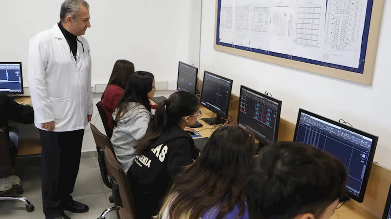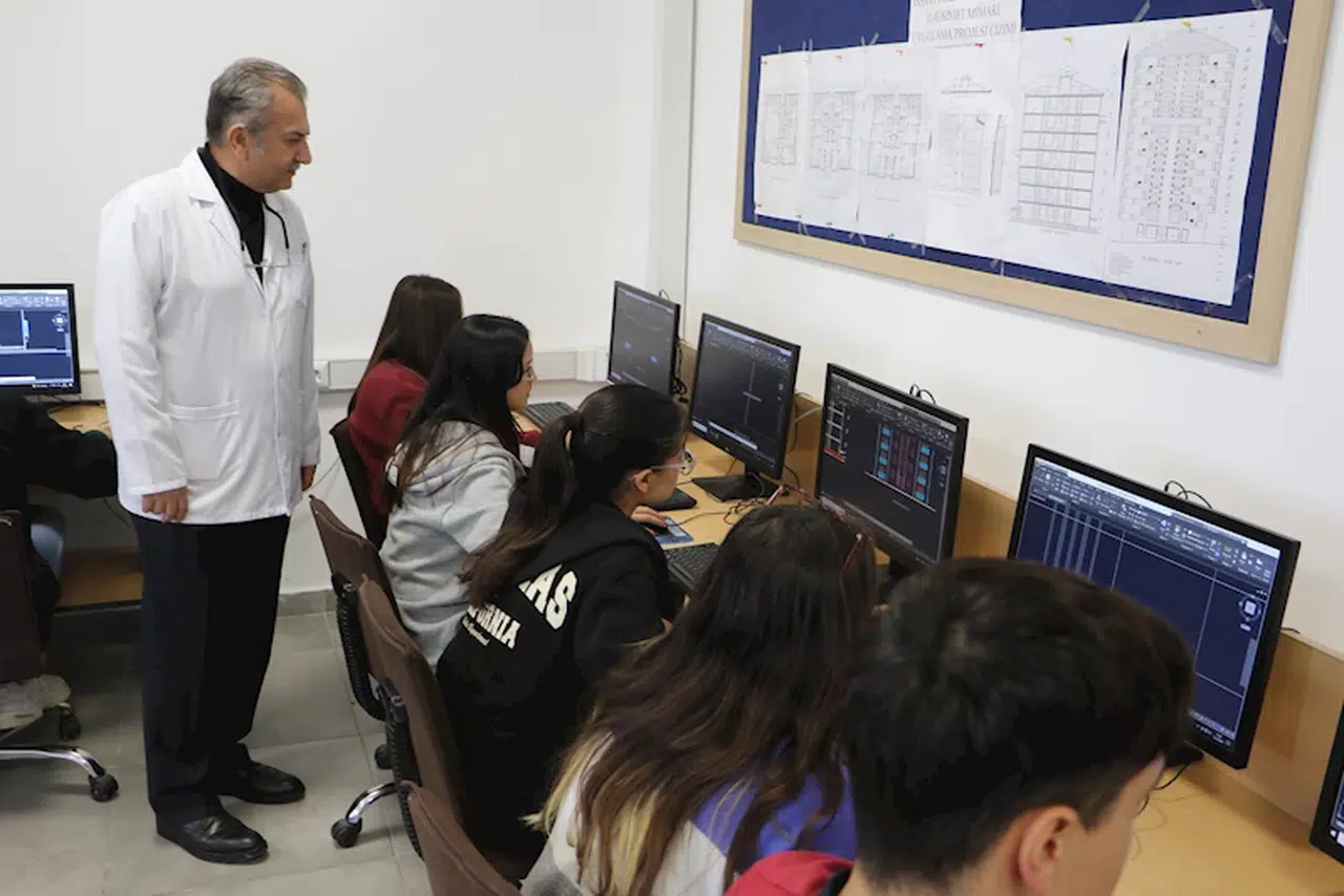 Öğrencilerin mesleki becerilerini nasıl geliştirdiklerini anlatan İnşaat Teknik Öğretmeni Mehmet Mert, “İnşaat Teknik Öğretmeni Mehmet Mert, “Öğrencilerimiz çift bilgisayarlı çizim programında çizim yapmaktalar. Okulumuzda Mimari Proje Teknik Ressamlığı Dalı, Statik Proje Teknik Ressamlığı Dalı ve İç Mekan Çizim Dalları olmak üzere 3 tane çizim dalımız mevcuttur. Öğrencilerimiz bilgisayarlı çizim programında mimar proje çizimi, iç mekan çizimi ve statik proje çizimi yapmaktalar. Okulu bitirdiklerinde teknik ressam olarak piyasada çalışmaktalar. Öğrencilerimizden başarılı olanlar da 4 yıllık yüksek öğretime geçmekteler. Kendi branşlarında mimarlık, teknik öğretmenlik veya inşaat mühendisliğini okumaktalar. Şuanda öğrencilerimizin bir kısmı 2 boyutlu olarak mimari proje çizimi ve 3 boyutlu modelleme yapıyorlar. 11’inci sınıftaki öğrenciler seneye mimarlık ve mühendislik büroları başta olmak üzere staj yapmaya gidecekler. Oradaki çalışmalara yardımcı olacaklar. Haftanın 2 günü okulda 3 günü de işletmede olacaklar. Bunun karşılığında da işletmelerden belli bir ücret alacaklar. Öğrenciler burada katların tasarımlarını yapıyor. Kat planları, kesitler, görünüşler, vaziyet planı gibi paftaları çiziyorlar” dedi.