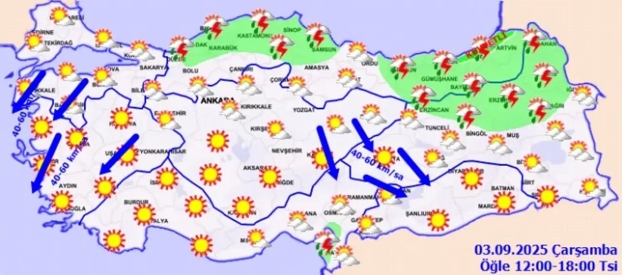 Ülkemizin kuzeydoğu kesimleri ile Doğu Akdeniz’in parçalı yer yer çok bulutlu, Batı Karadeniz’in doğusu, Orta Karadeniz kıyıları, Doğu Karadeniz ve Doğu Anadolu’nun kuzeyiyle Hatay kıyılarının yerel sağanak ve gök gürültülü sağanak yağışlı geçmesi bekleniyor.