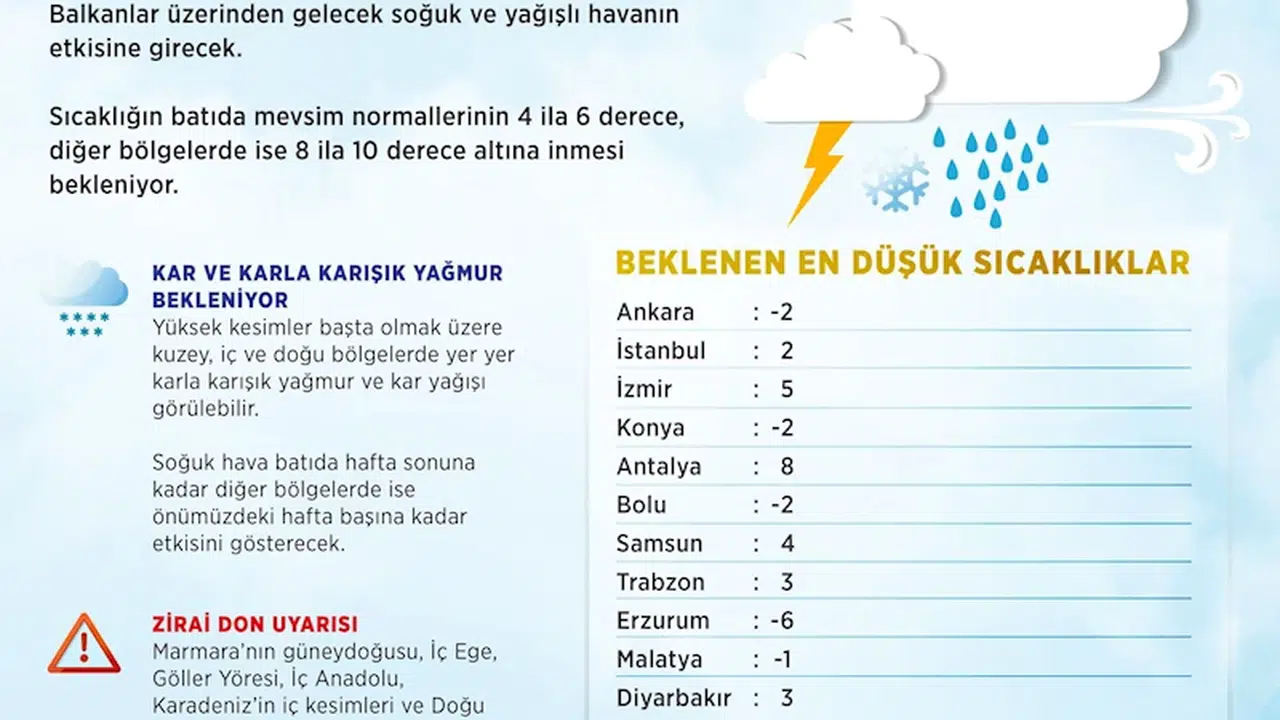 Çevre, Şehircilik ve İklim Değişikliği Bakanlığı'na bağlı Meteoroloji Genel Müdürlüğü'nün son meteorolojik değerlendirmelerine göre; Türkiye 7 Nisan Pazartesi gününden itibaren Balkanlar üzerinden gelecek soğuk ve yağışlı havanın etkisine girecek. Mevsim normalleri civarında seyreden hava sıcaklıkları, yarından itibaren kuzeybatı kesimlerden başlayarak yurt genelinde azalacak. Sıcaklığın batı kesimlerde mevsim normallerinin 4 ila 6 derece, diğer bölgelerde ise 8 ila 10 derece altına inmesi bekleniyor. Soğuk havanın, yurdun batısında hafta sonuna kadar, doğusunda ise önümüzdeki hafta başına kadar etkili olacağı tahmin ediliyor. Soğuk havayla birlikte, yüksek kesimler başta olmak üzere kuzey, iç ve doğu bölgelerde yer yer karla karışık yağmur ve kar yağışlarının görülmesi bekleniyor.