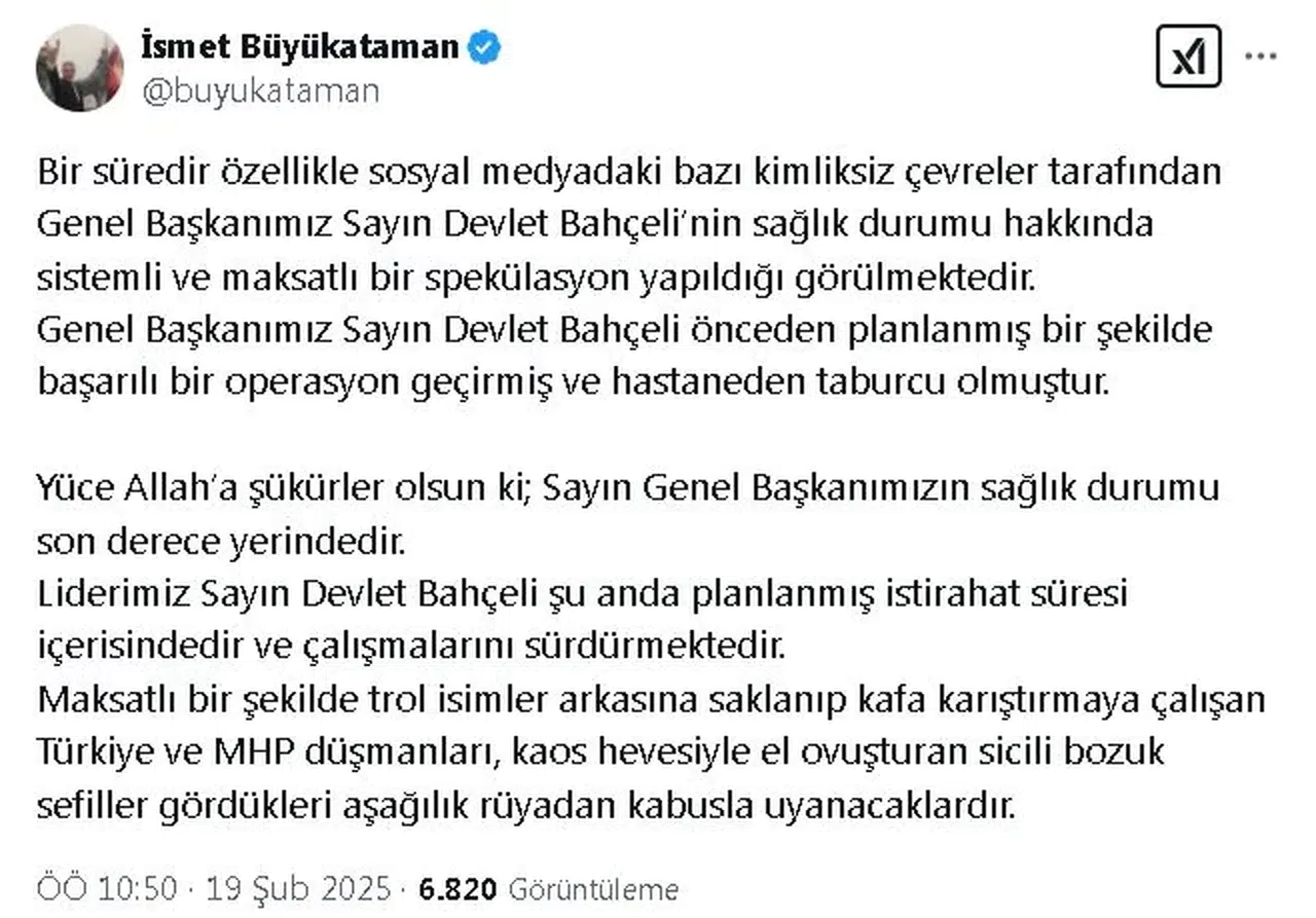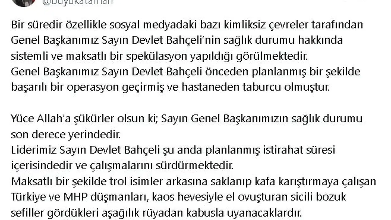 MHP'li Büyükataman, sosyal medya hesabından yaptığı açıklamada, "Bir süredir özellikle sosyal medyadaki bazı kimliksiz çevreler tarafından Genel Başkanımız Sayın Devlet Bahçeli'nin sağlık durumu hakkında sistemli ve maksatlı bir spekülasyon yapıldığı görülmektedir. Genel Başkanımız Sayın Devlet Bahçeli önceden planlanmış bir şekilde başarılı bir operasyon geçirmiş ve hastaneden taburcu olmuştur. Yüce Allah'a şükürler olsun ki Sayın Genel Başkanımızın sağlık durumu son derece yerindedir. Liderimiz Sayın Devlet Bahçeli şu anda planlanmış istirahat süresi içerisindedir ve çalışmalarını sürdürmektedir. Maksatlı bir şekilde trol isimler arkasına saklanıp kafa karıştırmaya çalışan Türkiye ve MHP düşmanları, kaos hevesiyle el ovuşturan sicili bozuk sefiller gördükleri aşağılık rüyadan kabusla uyanacaklardır" dedi. (DHA)
