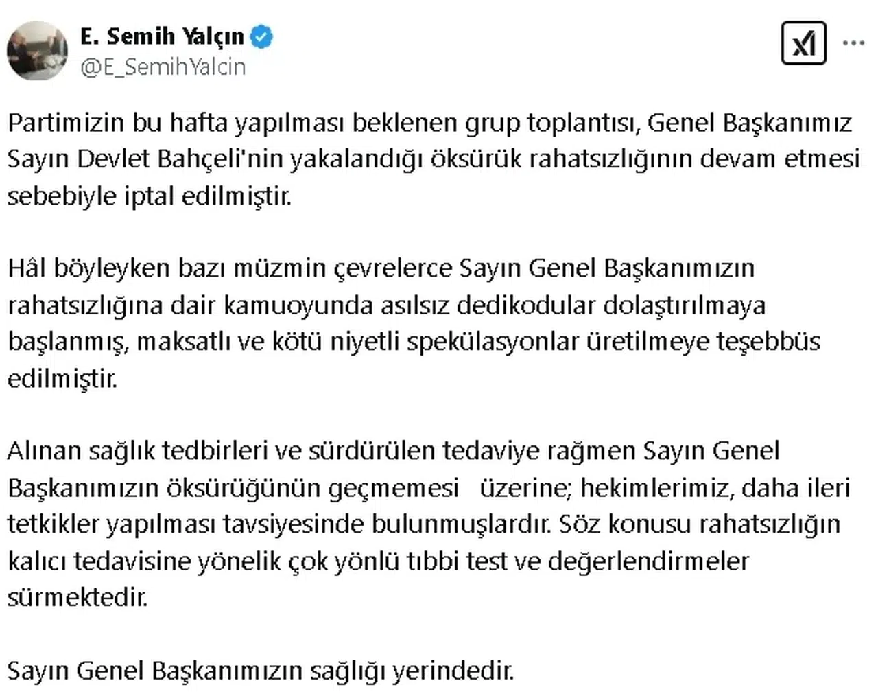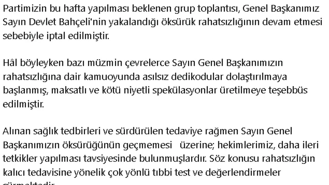 MHP Genel Başkan Yardımcısı Semih Yalçın, sosyal medya hesabı üzerinden MHP Genel Başkanı Devlet Bahçeli'nin sağlık durumuna ilişkin yaptığı açıklamada, "Partimizin bu hafta yapılması beklenen grup toplantısı, Genel Başkanımız Sayın Devlet Bahçeli'nin yakalandığı öksürük rahatsızlığının devam etmesi sebebiyle iptal edilmiştir. Hâl böyleyken bazı müzmin çevrelerce Sayın Genel Başkanımızın rahatsızlığına dair kamuoyunda asılsız dedikodular dolaştırılmaya başlanmış, maksatlı ve kötü niyetli spekülasyonlar üretilmeye teşebbüs edilmiştir. Alınan sağlık tedbirleri ve sürdürülen tedaviye rağmen Sayın Genel Başkanımızın öksürüğünün geçmemesi üzerine; hekimlerimiz, daha ileri tetkikler yapılması tavsiyesinde bulunmuşlardır. Söz konusu rahatsızlığın kalıcı tedavisine yönelik çok yönlü tıbbi test ve değerlendirmeler sürmektedir. Sayın Genel Başkanımızın sağlığı yerindedir" ifadelerini kullandı.