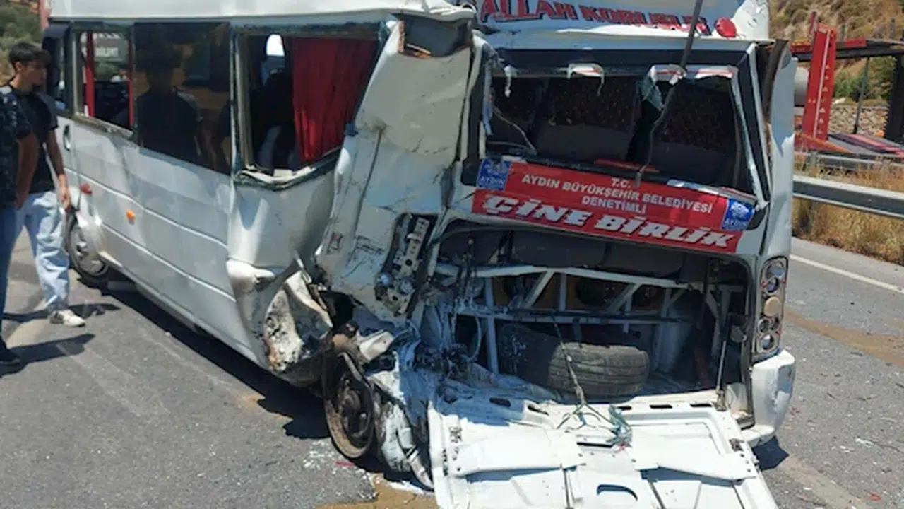 Kaza, dün saat 13.00 sıralarında, Aydın-Muğla kara yolu Dorumlar Mahallesi Karatepe mevkisinde meydana geldi. Çine'den Efeler ilçesine yolcu taşıyan Ahmet Öz (22) yönetimindeki 09 M 4712 plakalı yolcu minibüsüne, arkadan gelen Mehmet Sarıgül (72) idaresindeki 48 AAJ 819 plakalı midibüs çarptı. Kazada, sürücülerle birlikte 17 kişi yaralandı. İhbarla kaza yerine jandarma ve sağlık ekipleri sevk edildi. Yaralılar, çevre hastanelere kaldırıldı. Hastanede tedavilerinin ardından her 2 araç sürücüsünün de aralarında olduğu 13 yaralı dün akşam saatlerinde taburcu edildi. Diğer 4 yaralının ise tedavilerinin sürdüğü bildirildi. Öte yandan, taburcu olan 2 sürücü de jandarmadaki ifadelerinin ardından serbest bırakıldı. (DHA)