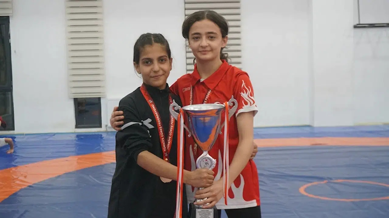 Akif ÖZALP/SİİRT, (DHA)- SİİRT’te, milli güreşçi Evin Demirhan’la yaptıkları antrenman sırasında şampiyonluk sözü veren Mercan Nas (14) ve Damla Beyan (13), Tekirdağ’da düzenlenen U-15 Türkiye Kadınlar Güreş Türkiye Şampiyonası’nda karşılaştıkları rakiplerini yenerek şampiyon oldu.