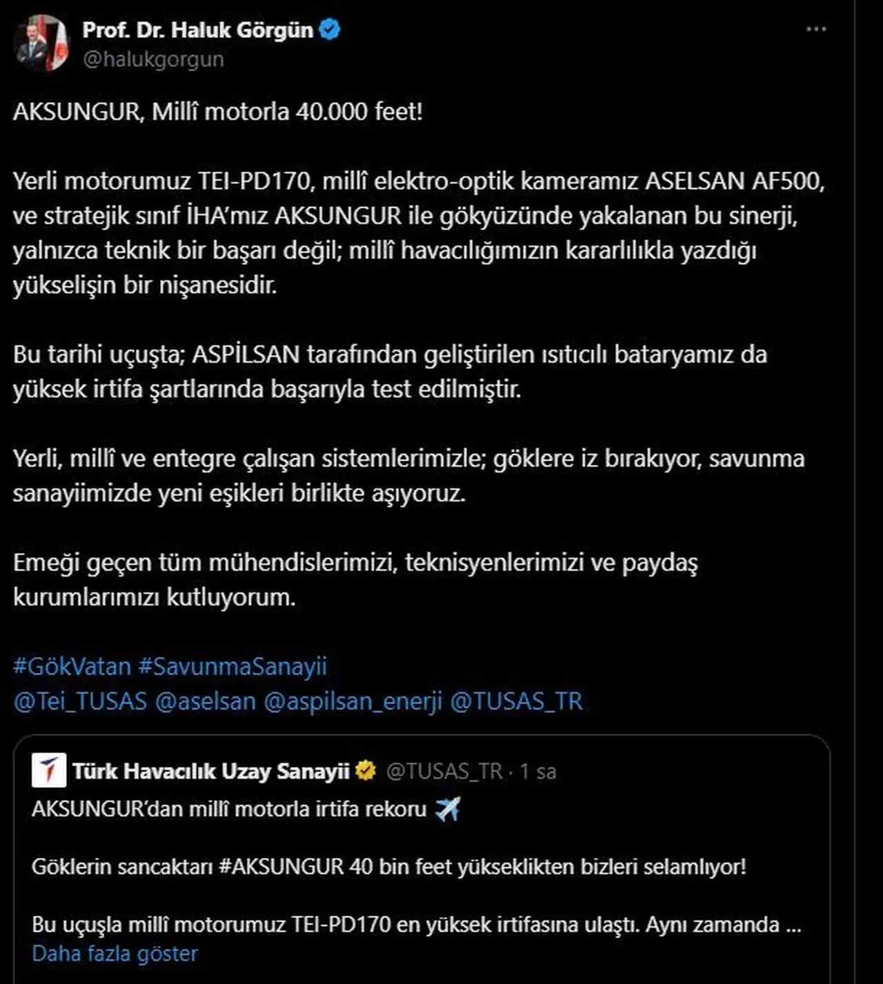Savunma Sanayii Başkanı Haluk Görgün, 'AKSUNGUR, milli motorla 40 bin feet' başlığıyla sosyal medya hesabından bir açıklama yaptı. Görgün, "Yerli motorumuz TEI-PD170, milli elektro-optik kameramız ASELSAN AF500 ve stratejik sınıf İHA'mız AKSUNGUR ile gökyüzünde yakalanan bu sinerji, yalnızca teknik bir başarı değil; milli havacılığımızın kararlılıkla yazdığı yükselişin bir nişanesidir. Bu tarihi uçuşta; ASPİLSAN tarafından geliştirilen ısıtıcılı bataryamız da yüksek irtifa şartlarında başarıyla test edilmiştir. Yerli, milli ve entegre çalışan sistemlerimizle; göklere iz bırakıyor, savunma sanayimizde yeni eşikleri birlikte aşıyoruz. Emeği geçen tüm mühendislerimizi, teknisyenlerimizi ve paydaş kurumlarımızı kutluyorum" dedi. (DHA)