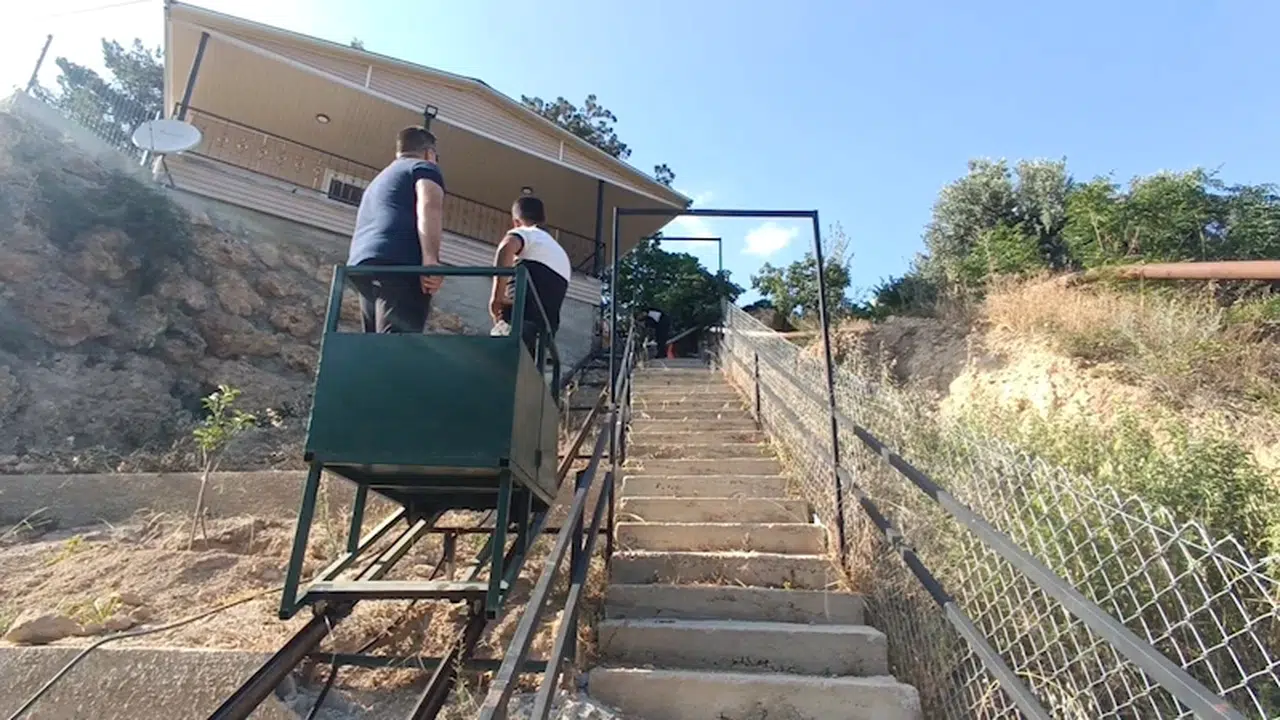Atike CEYLAN KAÇAR/SİLİFKE (Mersin), (DHA)- MERSİN'in Silifke ilçesinde yaşayan Hasan Say, evine rahatça çıkabilmek için raylı sistem yaptırdı. Say, misafirliğe gelen yaş almış misafirlerini bu sistemle yukarı çıkartıp, evine taşıyor.