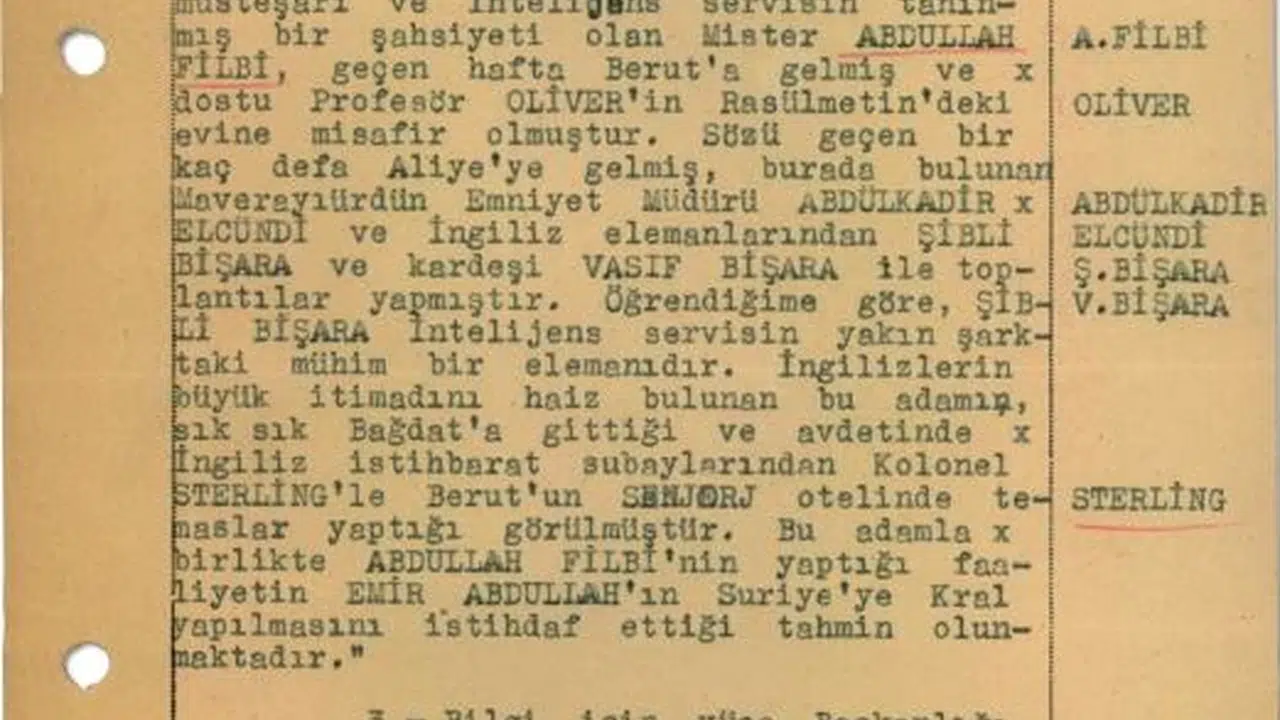 "Maverayıürdün'deki İngiliz müsteşarı ve İntelijans Servisi'nin tanınmış bir şahsiyeti olan Mister Abdullah Filbi, geçen hafta Beyrut'a gelmiş ve dostu Profesör Oliver'in Rasülmetin'deki evine misafir olmuştur. Sözü geçen; birkaç defa Aliye'ye gelmiş, burada bulunan Maverayıürdün Emniyet Müdürü Abdülkadir El-Cündi ve İngiliz elemanlarından Şibli Bişara ve kardeşi Vasıf Bişara ile toplantılar yapmıştır. Öğrendiğime göre; Şibli Bişara, İntelijans Servis'nin yakın şarktaki mühim bir elemanıdır. İngilizlerin büyük itimadını haiz bulunan bu adamın sık sık Bağdat'a gittiği ve avdetinde İngiliz istihbarat subaylarından Kolonel Sterling ile Beyrut'un Senjorj Oteli'nde temaslar yaptığı görülmüştür. Bu adamla birlikte Abdullah Filbi'nin yaptığı faaliyetin, Emir Abdullah'ın Suriye'ye kral yapılmasını istihdaf ettiği tahmin olunmaktadır." (DHA)