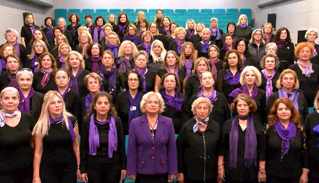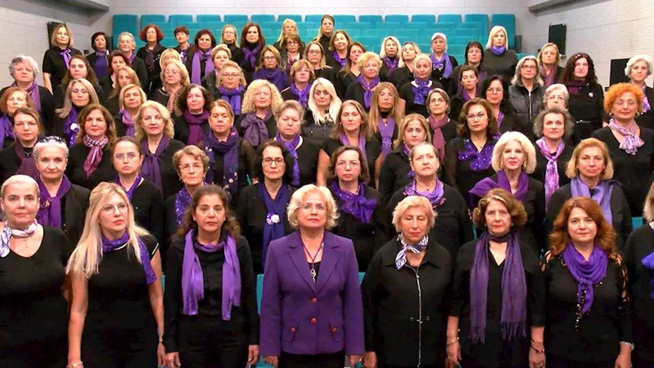 Barış YILMAZ/BURSA, (DHA)-BURSA’da, hiç müzik eğitimi almamış, yaşları 40 ile 75 arasında değişen Nilüfer Kadın Korosu Derneği üyeleri, ‘25 Kasım Kadına Yönelik Şiddete Karşı Uluslararası Mücadele Günü’ kapsamında, koro şefi Dr. Aysel Gürel’in (64) yazıp, bestelediği şarkıyı seslendirdi. ‘Şiddetsiz Dünya’ adlı şarkıda Özgecan Aslan ve Narin Güran’a da yer veren koro üyeleri, sahneye ise kadına şiddeti simgeleyen mor renkli fularlarla çıktı.