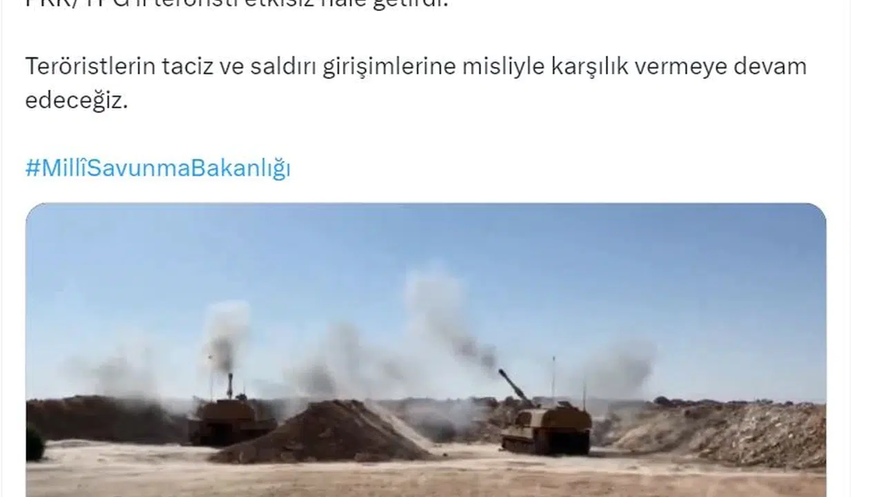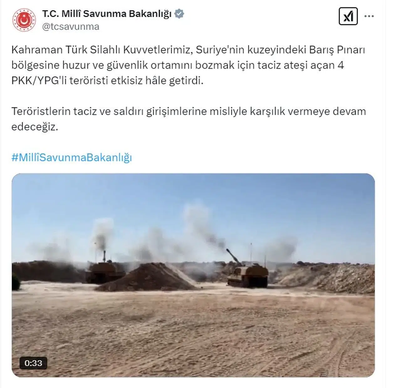 Bakanlığın sosyal medya hesabından yapılan açıklamada, "Kahraman Türk Silahlı Kuvvetlerimiz, Suriye'nin kuzeyindeki Barış Pınarı bölgesine huzur ve güvenlik ortamını bozmak için taciz ateşi açan 4 PKK/YPG'li teröristi etkisiz hale getirdi. Teröristlerin taciz ve saldırı girişimlerine misliyle karşılık vermeye devam edeceğiz" denildi. (DHA)