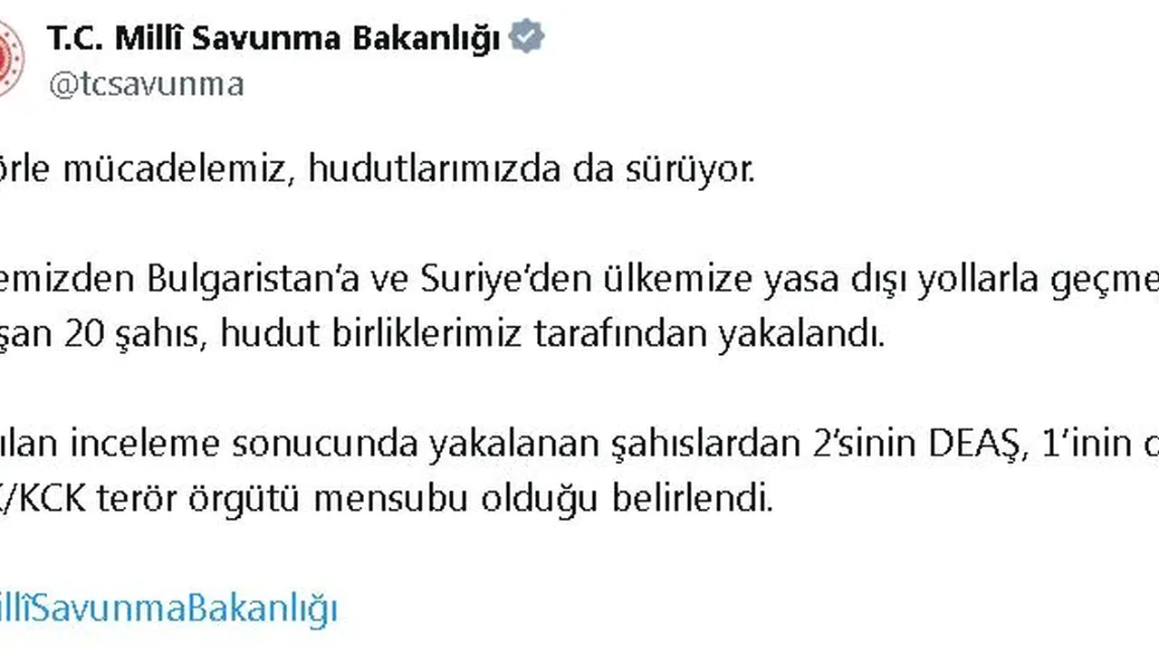 ANKARA, (DHA)- MİLLİ Savunma Bakanlığı (MSB), yasa dışı yollarla Türkiye'den Bulgaristan'a ve Suriye'den Türkiye'ye geçmeye çalışan 2'si DEAŞ, 1'i PKK/KCK mensubu 20 kişinin hudut birliklerince yakalandığını açıkladı.