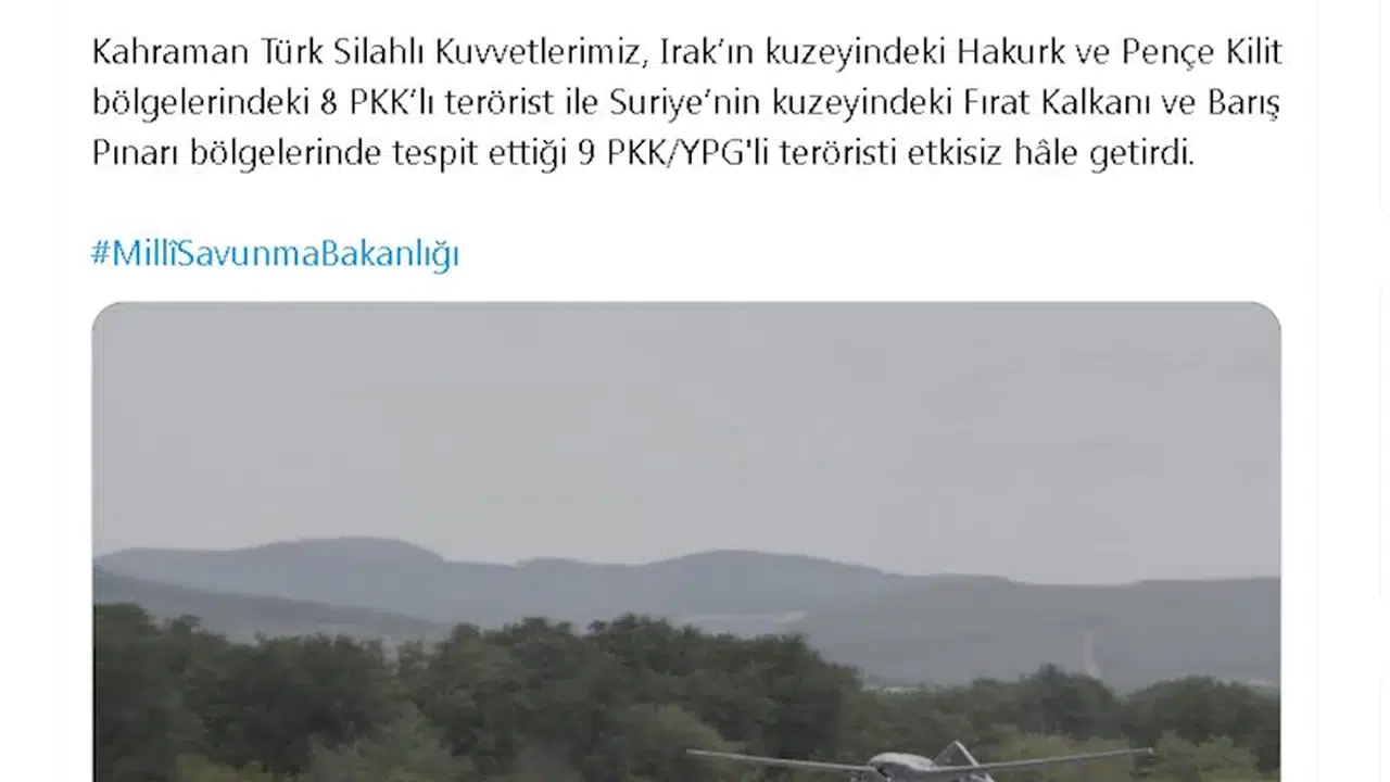 ANKARA, (DHA)- MİLLİ Savunma Bakanlığı (MSB), Irak ve Suriye'nin kuzeyinde toplam 17 PKK/YPG'li teröristin etkisiz hale getirildiğini açıkladı.