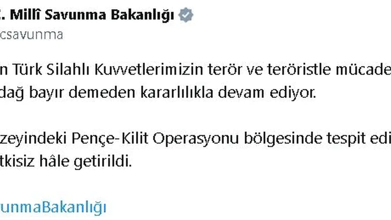 Bakanlığın sosyal medya hesabından yapılan açıklamada, "Kahraman Türk Silahlı Kuvvetlerimizin terör ve teröristle mücadelesi gece gündüz, dağ bayır demeden kararlılıkla devam ediyor. Irak'ın kuzeyindeki Pençe-Kilit Operasyonu bölgesinde tespit edilen 2 PKK'lı terörist etkisiz hale getirildi" denildi. (DHA)