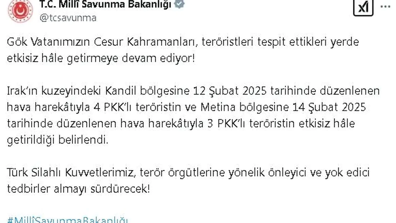 Bakanlığın sosyal medya hesabından yapılan açıklamada, "Gök vatanımızın cesur kahramanları, teröristleri tespit ettikleri yerde etkisiz hale getirmeye devam ediyor. Irak'ın kuzeyindeki Kandil bölgesine 12 Şubat 2025 tarihinde düzenlenen hava harekatıyla 4 PKK'lı teröristin ve Metina bölgesine 14 Şubat 2025 tarihinde düzenlenen hava harekatıyla 3 PKK'lı teröristin etkisiz hale getirildiği belirlendi. Türk Silahlı Kuvvetlerimiz, terör örgütlerine yönelik önleyici ve yok edici tedbirler almayı sürdürecek" denildi. (DHA)