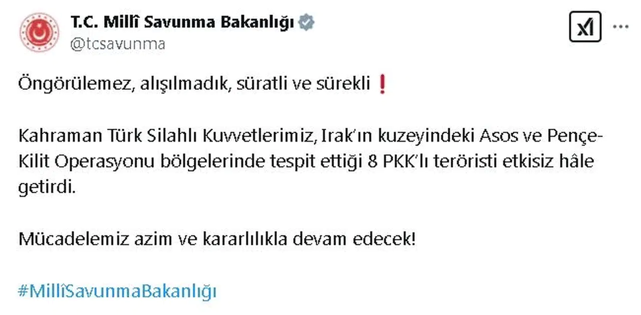 Bakanlığın sosyal medya hesabından yapılan açıklamada, "Öngörülemez, alışılmadık, süratli ve sürekli. Kahraman Türk Silahlı Kuvvetlerimiz, Irak'ın kuzeyindeki Asos ve Pençe-Kilit Operasyonu bölgelerinde tespit ettiği 8 PKK'lı teröristi etkisiz hale getirdi. Mücadelemiz azim ve kararlılıkla devam edecek" denildi. (DHA)