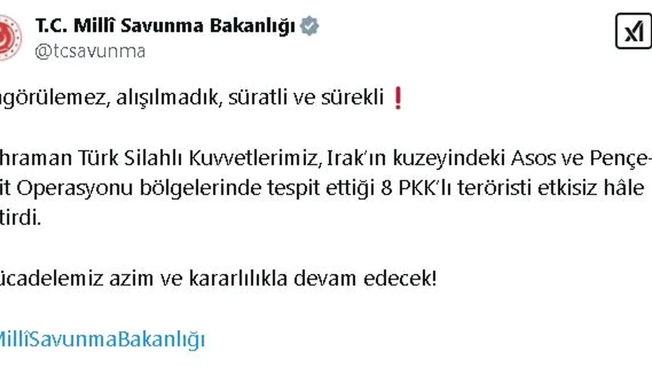 ANKARA, (DHA)- MİLLİ Savunma Bakanlığı (MSB), Irak'ın kuzeyinde 8 PKK'lı teröristin etkisiz hale getirildiğini açıkladı.