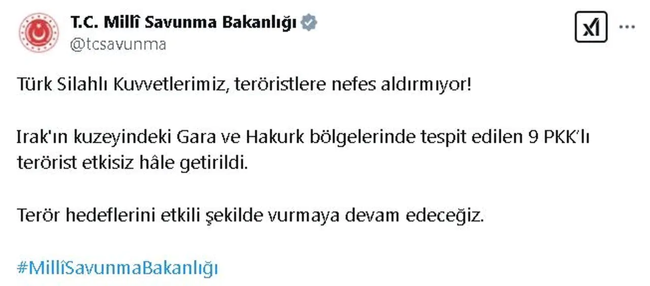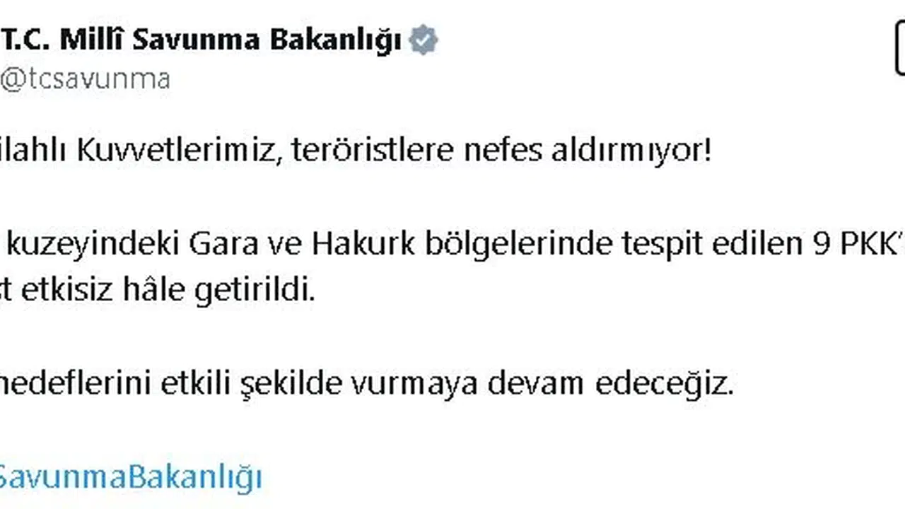 Bakanlığın sosyal medya hesabından yapılan açıklamada, "Türk Silahlı Kuvvetlerimiz, teröristlere nefes aldırmıyor. Irak'ın kuzeyindeki Gara ve Hakurk bölgelerinde tespit edilen 9 PKK'lı terörist etkisiz hale getirildi. Terör hedeflerini etkili şekilde vurmaya devam edeceğiz" denildi. (DHA)