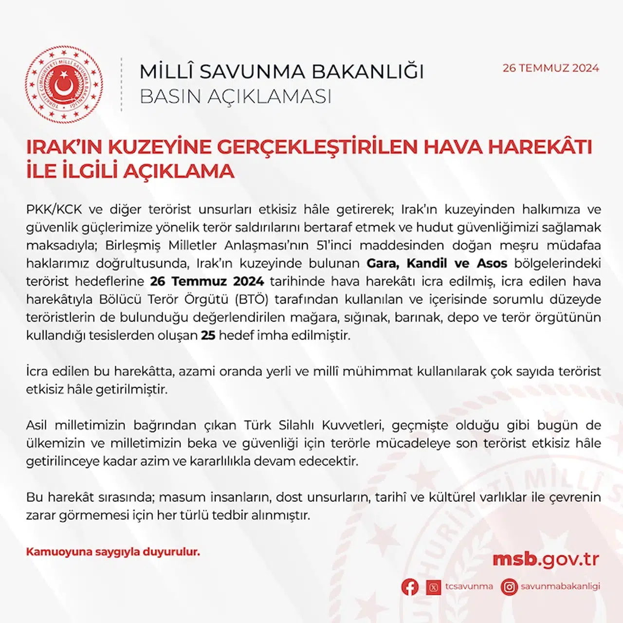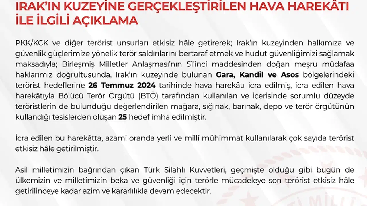 Milli Savunma Bakanlığı (MSB) sosyal medya hesabından yapılan açıklamaya göre, PKK/KCK ve diğer terörist unsurları etkisiz hale getirerek Irak’ın kuzeyinden Türkiye’ye yönelik saldırıları bertaraf etmek ve hudut güvenliği sağlamak amacıyla Birleşmiş Milletler Anlaşması’nın 51’inci maddesinden doğan meşru müdafaa hakkı doğrultusunda Irak’ın kuzeyinde bulunan Gara, Kandil ve Asos bölgelerindeki terörist hedeflerine hava harekatı düzenlendi. Düzenlenen hava harekatıyla Bölücü Terör Örgütü (BTÖ) tarafından kullanılan ve içerisinde sorumlu düzeyde teröristlerin de bulunduğu değerlendirilen mağara, sığınak, barınak, depo ve terör örgütünün kullandığı tesislerden oluşan 25 hedef imha edildi.