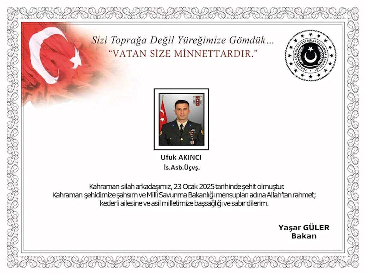 Milli Savunma Bakanlığı, sosyal medya hesabından yapılan paylaşımda, "Pençe-Kaplan operasyonu bölgesinde, bölücü terör örgütü mensupları tarafından açılan taciz ateşi sonucu ağır yaralanan kahraman silah arkadaşımız İstihkam Astsubay Üstçavuş Ufuk Akıncı'nın hastanede yapılan tüm müdahalelere rağmen kurtarılamayarak 23 Ocak 2025 tarihinde şehit olduğu bildirildi. Bizleri derin bir acı ve üzüntüye boğan bu olayda hayatını kaybeden aziz şehidimize Allah’tan rahmet, kederli ailesine, Türk Silahlı Kuvvetleri ile asil milletimize başsağlığı ve sabır dileriz" ifadeleri kullanıldı. (DHA)