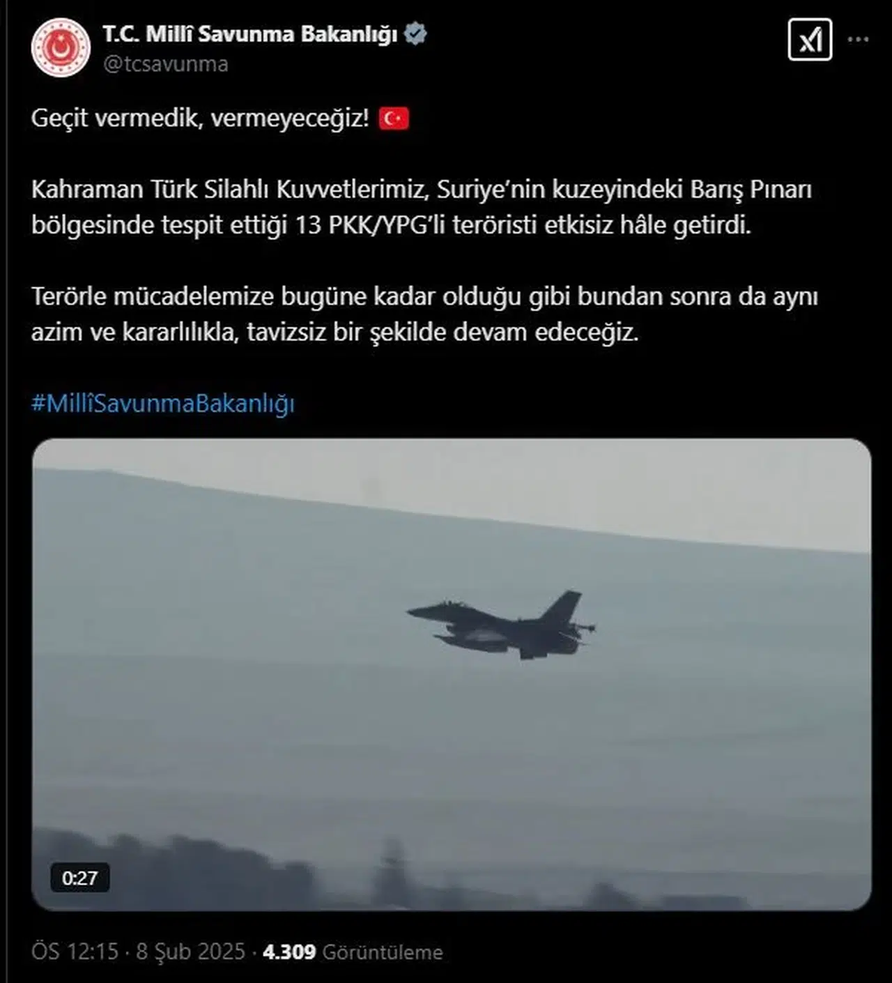 Ruken KADIOĞLU/ANKARA, (DHA)-MİLLİ Savunma Bakanlığı (MSB), Suriye'nin kuzeyinde 13 PKK/YPG'li teröristin etkisiz hale getirdiğini açıkladı.