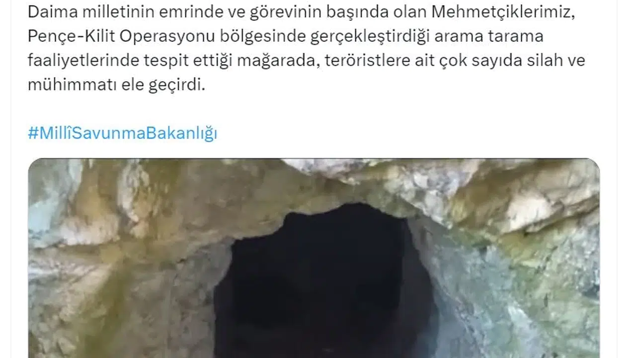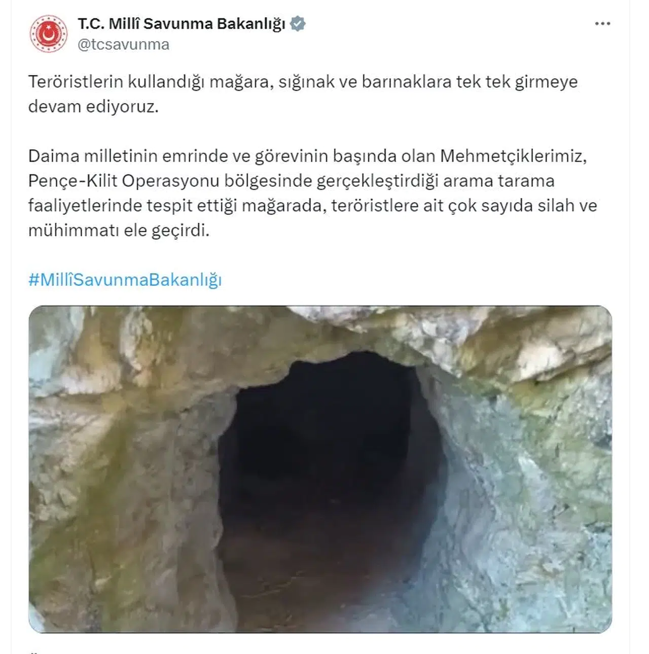 ANKARA, (DHA)- MİLLİ Savunma Bakanlığı (MSB), Pençe-Kilit Operasyonu bölgesinde teröristlerin kullandığı mağarada çok sayıda silah ve mühimmat ele geçirildiğini duyurdu.