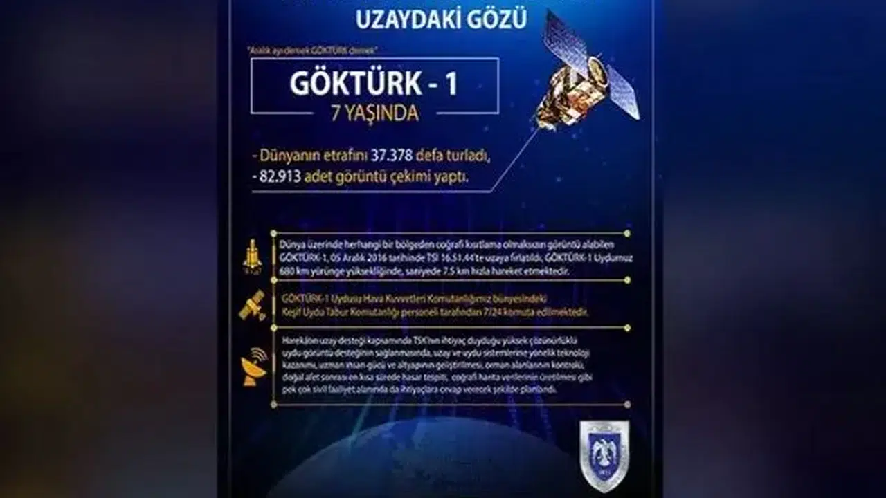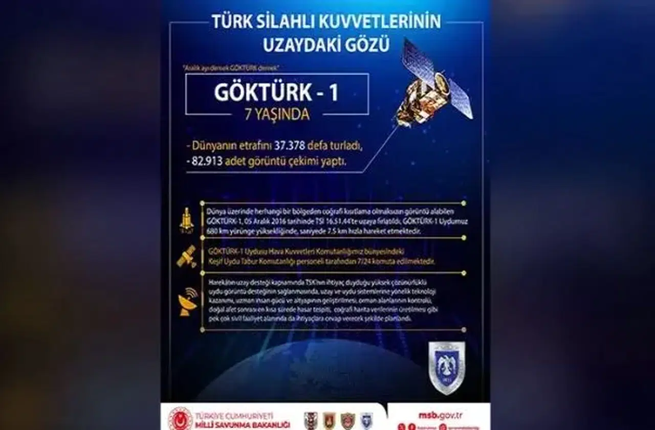 MSB, Türkiye’nin gözlem uydularından birisi olan Göktürk-1 uydusunun 7'nci yaşını kutlayan bir paylaşım yaptı. 5 Aralık 2016 yılında Fransız Guyanası'ndaki Koruou Fırlatma Merkezi'nden fırlatılarak göreve başlayan Göktürk-1 uydusuyla ilgili sosyal medya üzerinden yapılan paylaşımda, “Uzaydaki gözümüz olan Göktürk-1 uydusu 7 yaşında; dünyanın etrafını 37 bin 378 defa turladı, 82 bin 13 adet görüntü çekimi yaptı. Dünya üzerinde herhangi bir bölgeden coğrafi kısıtlama olmaksızın görüntü alabilen Göktürk-1, 05 Aralık 2016 tarihinde TSI 16.51.44'te uzaya fırlatıldı. GÖKTÜRK-1 Uydumuz 680 km yörünge yüksekliğinde, saniyede 7.5 km hızla hareket etmektedir. Göktürk-1 Uydusu Hava Kuvvetleri Komutanlığımız bünyesindeki Keşif Uydu Tabur Komutanlığı personeli tarafından 7/24 komuta edilmektedir. Harekâtın uzay desteği kapsamında TSK'nın ihtiyaç duyduğu yüksek çözünürlüklü uydu görüntü desteğinin sağlanmasında, uzay ve uydu sistemlerine yönelik teknoloji kazanımı, uzman insan gücü ve altyapının geliştirilmesi, orman alanlarının kontrolü, doğal afet sonrası en kısa sürede hasar tespiti, coğrafi harita verilerinin üretilmesi gibi faaliyet alanında da ihtiyaçlara cevap verecek şekilde planlandı” ifadelerine yer verildi.