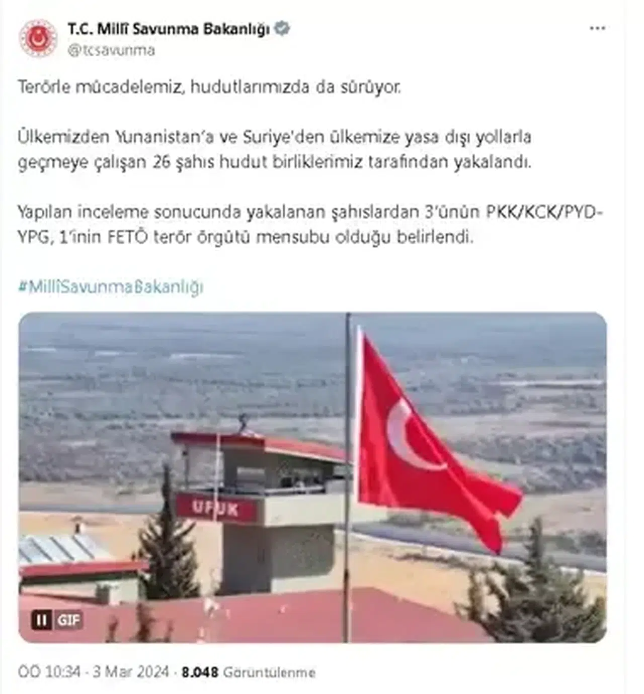 Bakanlığın sosyal medya hesabından yapılan açıklamada, "Terörle mücadelemiz, hudutlarımızda da sürüyor. Ülkemizden Yunanistan’a ve Suriye'den ülkemize yasa dışı yollarla geçmeye çalışan 26 şahıs hudut birliklerimiz tarafından yakalandı. Yapılan inceleme sonucunda yakalanan şahıslardan 3’ünün PKK/KCK/PYD-YPG, 1’inin FETÖ terör örgütü mensubu olduğu belirlendi" denildi.