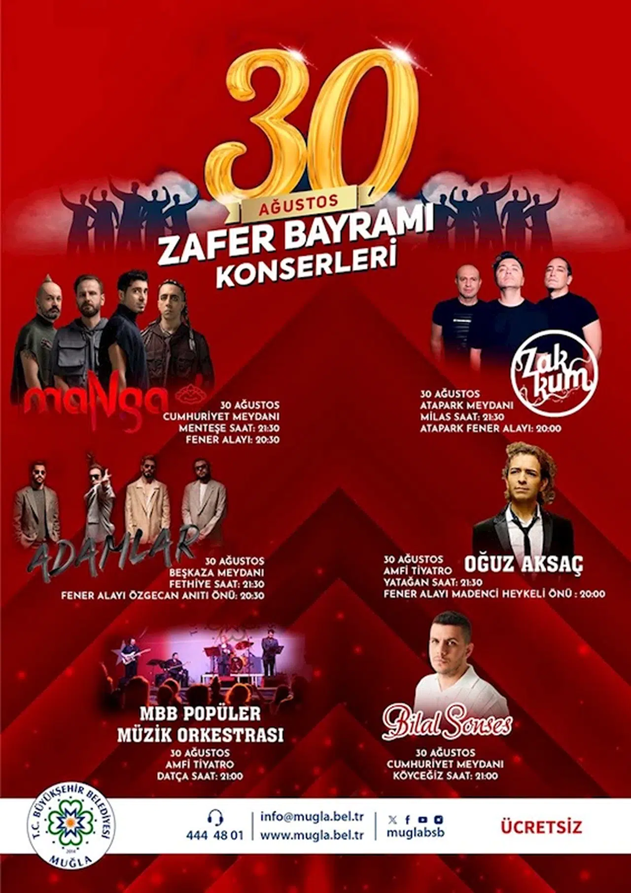 Muğla Büyükşehir Belediyesi, 30 Ağustos'ta Muğla'nın altı farklı ilçesinde şarkıcıları vatandaşlarla buluşturacak. Menteşe ilçesinde Manga, Milas'ta Zakkum, Fethiye'de Adamlar, Yatağan'da Oğuz Aksaç, Datça'da MBB Popüler Müzik Orkestrası ve Köyceğiz'de Bilal Sonses sahne alacak. Kutlamalar kapsamında düzenlenecek konserlerin yanı sıra çeşitli kültürel ve sanatsal etkinlikler de düzenlenecek.