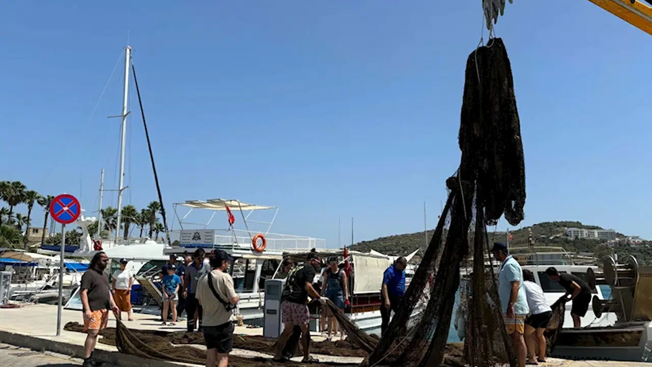 Evren ERSOY / DATÇA (Muğla), (DHA)-MUĞLA'nın Datça’da ilçesinde 14 yıldır deniz altında duran 100 metre boyundaki '’hayalet ağ'’ yapılan çalışma ile karaya çıkarıldı. Kıyıda da temizlik çalışması yapıldı.