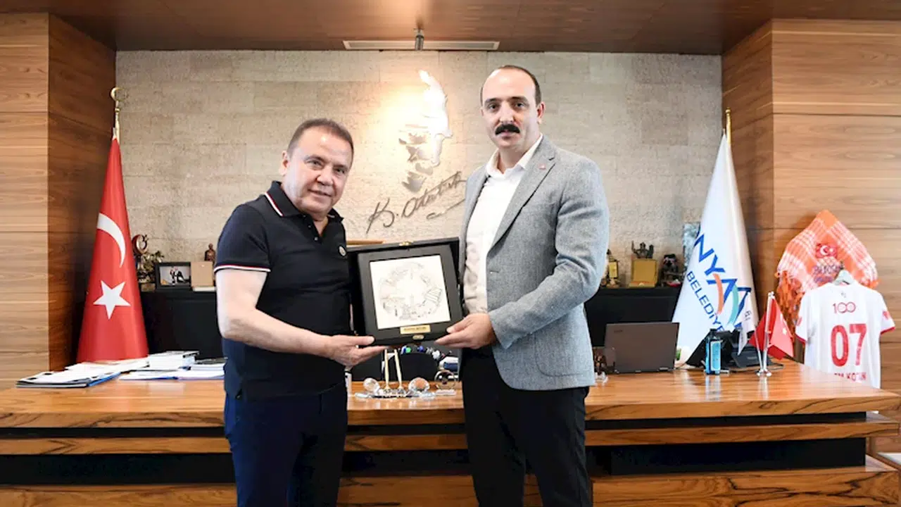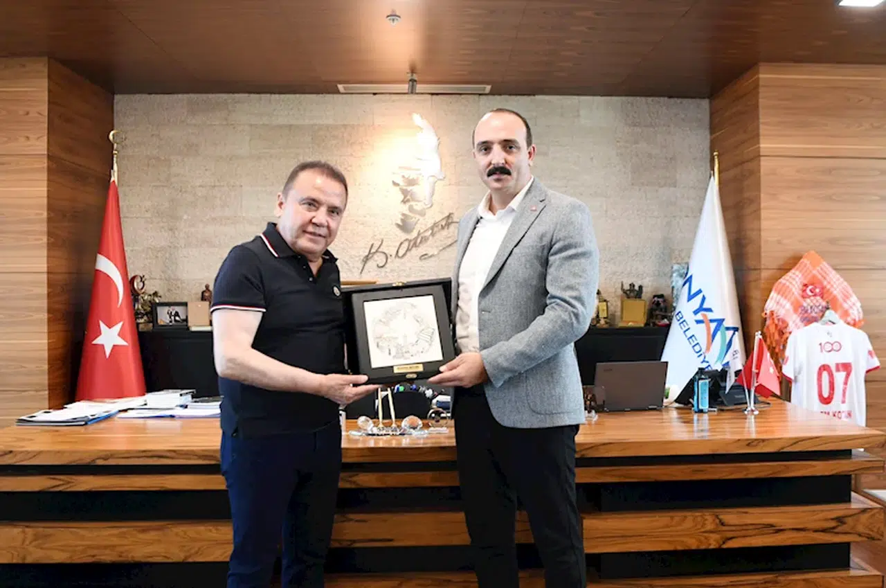 ANTALYA, (DHA) - ANTALYA Büyükşehir Belediye Başkanı Muhittin Böcek, Konyaaltı Belediye Başkanı Cem Kotan'ı makamında ziyaret etti. Başkan Kotan Başkan Böcek'i, “Evinize hoş geldiniz" diyerek karşıladı.