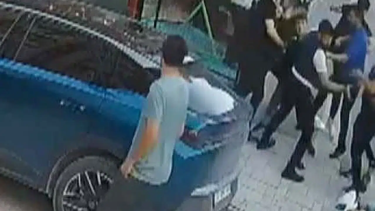 Kavga anı ise yan taraftaki iş yerinin güvenlik kamerasına yansıdı. Önce 2 kişinin koluna girdikleri 1 kişiyi güçlükle olay yerinden götürdüğü görülürken, ardından diğer grup arasında yaşanan tekme ve yumruklu kavga anları görüntüde yer aldı. (DHA)