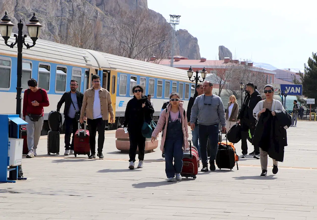 Trenle Van'a gelen turistler, alışveriş festivali ve nevruz tatillerini geçirmek için geldiklerini, burada alışveriş yaptıktan sonra ülkelerine döneceklerini, tren yolculuğunun da çok güzel geçtiğini dile getirdiler. (DHA)