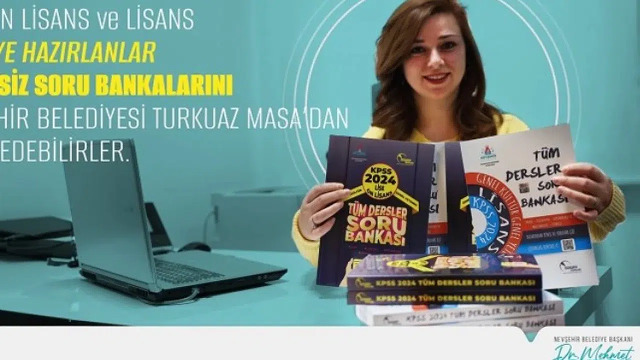 Lise, Ön Lisans ve Lisans düzeylerinde sınava girecek olan adaylar soru bankalarını hafta içi 08.00-17.00 saatleri arasında Nevşehir Belediyesi Başkanlık Binası girişinde bulunan Turkuaz Masa’ya başvurarak ücretsiz olarak alabilecek.