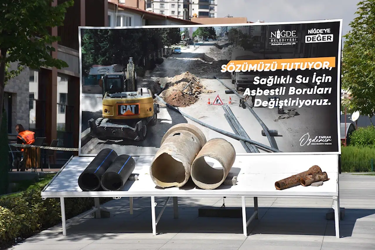 Niğde Belediye Başkanı Emrah Özdemir, ‘’Niğde’mizde büyük bir bölümünü değiştirdiğimiz eski asbest boruları meydanda sergiliyoruz. Gelecek nesillerimizin kanser olma riskini en aza indirmek için üzerimize düşen görevi yapıyoruz’’ dedi.(DHA)