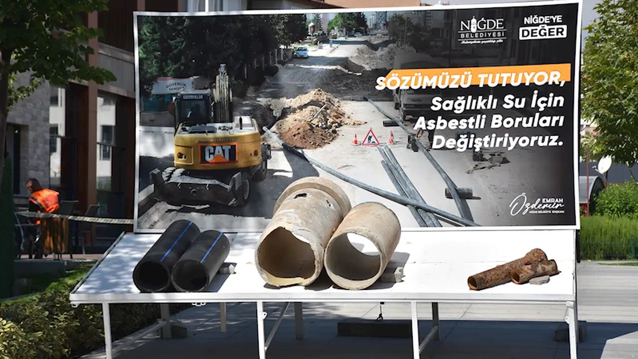 Niğde Belediyesi tarafından insan sağlığını olumsuz etkileyen ve şehir şebeke suyunun içerisinde geçtiği asbestli boruların değişim çalışmaları tüm hızıyla devam ediyor. Yapılan çalışmalar sırasında sökülen asbestli borular Ömer Halisdemir Meydanı'nda görücüye çıkarıldı. Vatandaşların yoğun ilgi gösterdiği asbestli boruların halini gören vatandaşlar şaşkınlık içerisinde borular inceledi.