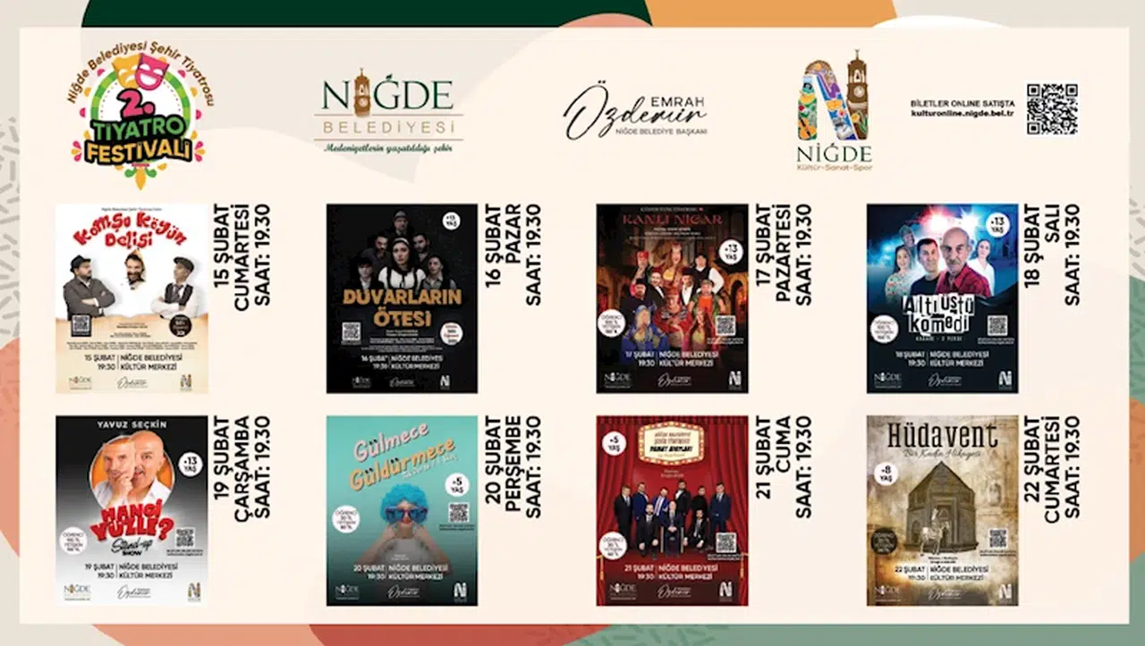 Festival, 15-22 Şubat tarihleri arasında gerçekleşecek. Tüm oyunlar, Niğde Belediyesi Kültür Merkezi'nde saat 19.30'da sahnelenecek. Sanatseverler hem usta tiyatrocuların sahnelediği oyunları hem de Niğde Belediyesi Şehir Tiyatrosu'nun özel gösterimlerini izleme fırsatı bulacak. (DHA)