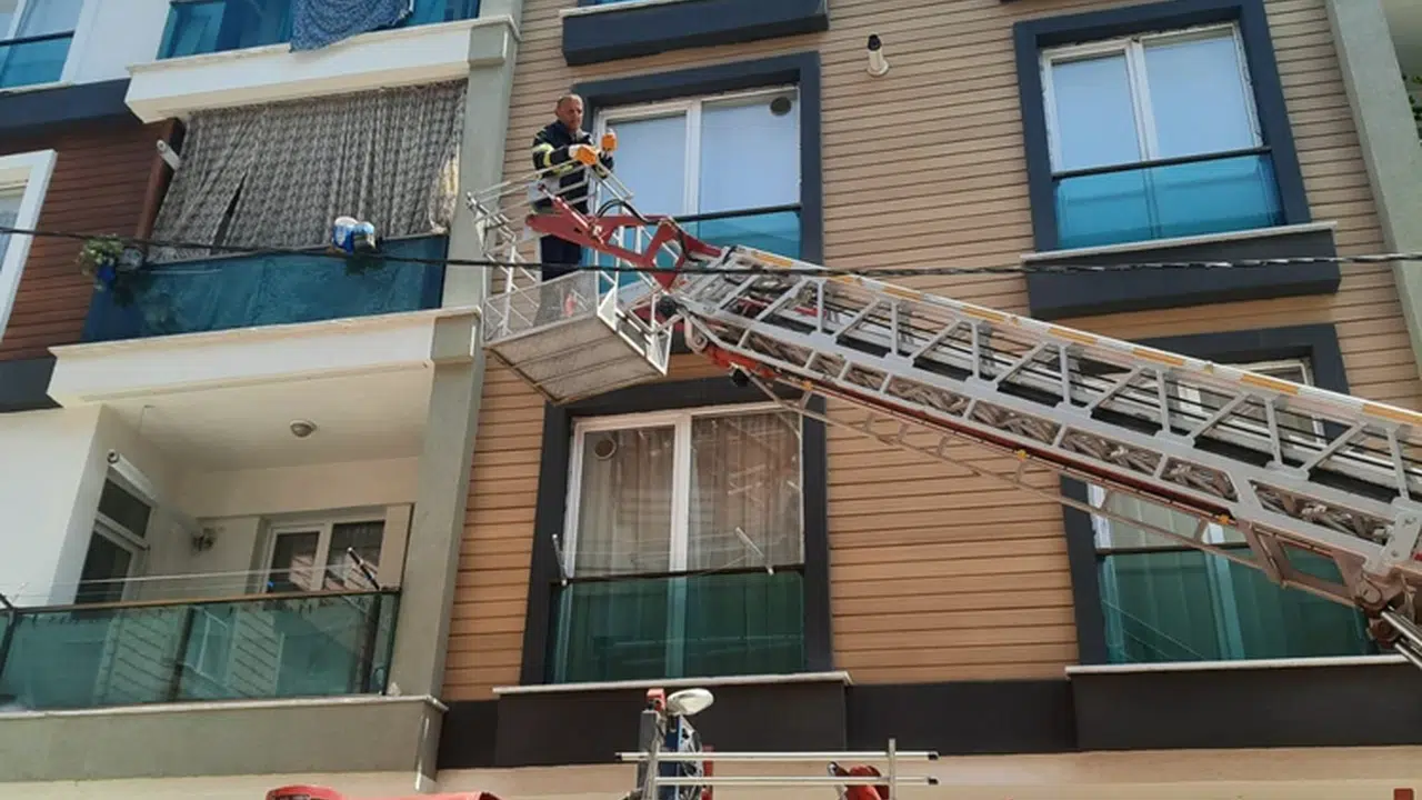 İtfaiye ekipleri yangın merdiveni ile ulaştıkları penceredeki kumru yavrusunu sıkıştığı yerden kurtardı.
