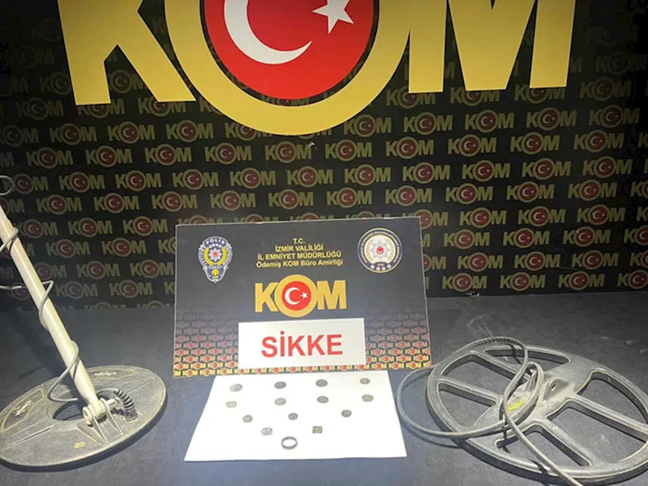 Kadir ÖZEN / İZMİR, (DHA)-İZMİR'in Ödemiş ilçesinde, polisin bir eve düzenlediği operasyonda Roma ve Helenistik dönemine ait 13 sikke, Bizans dönemine ait 1 yüzük ele geçirilirken 1 kişi gözaltına alındı.