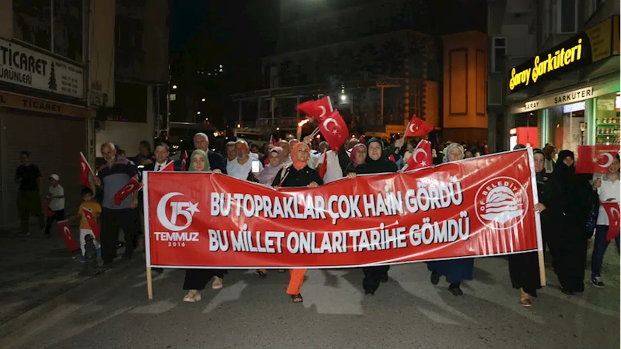 Of Çarşıbaşı Büyük Camisi önünde toplanan Kaymakam Demirer, Başkan Sarıalioğlu, protokol üyeleri ile vatandaşlar, Barbaros Caddesi ve Atatürk Bulvarı üzerinden Belediye Meydanı'na kadar meşaleler ve bayraklar eşliğinde yürüdü.