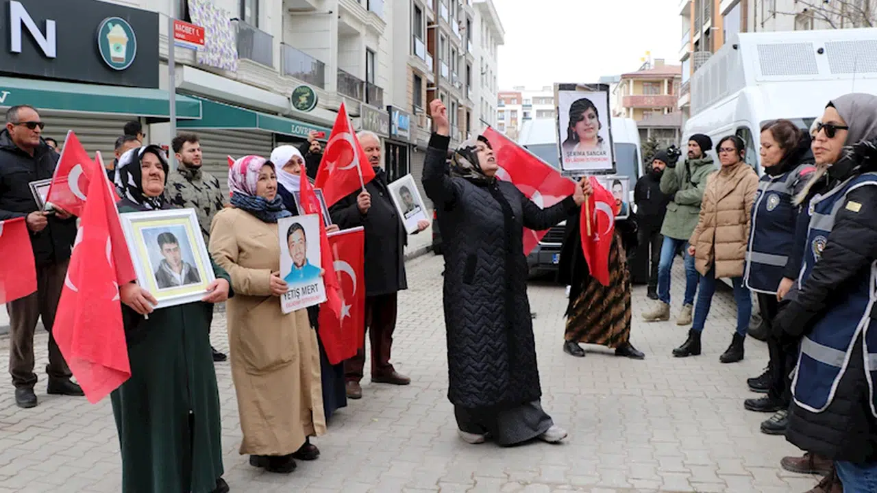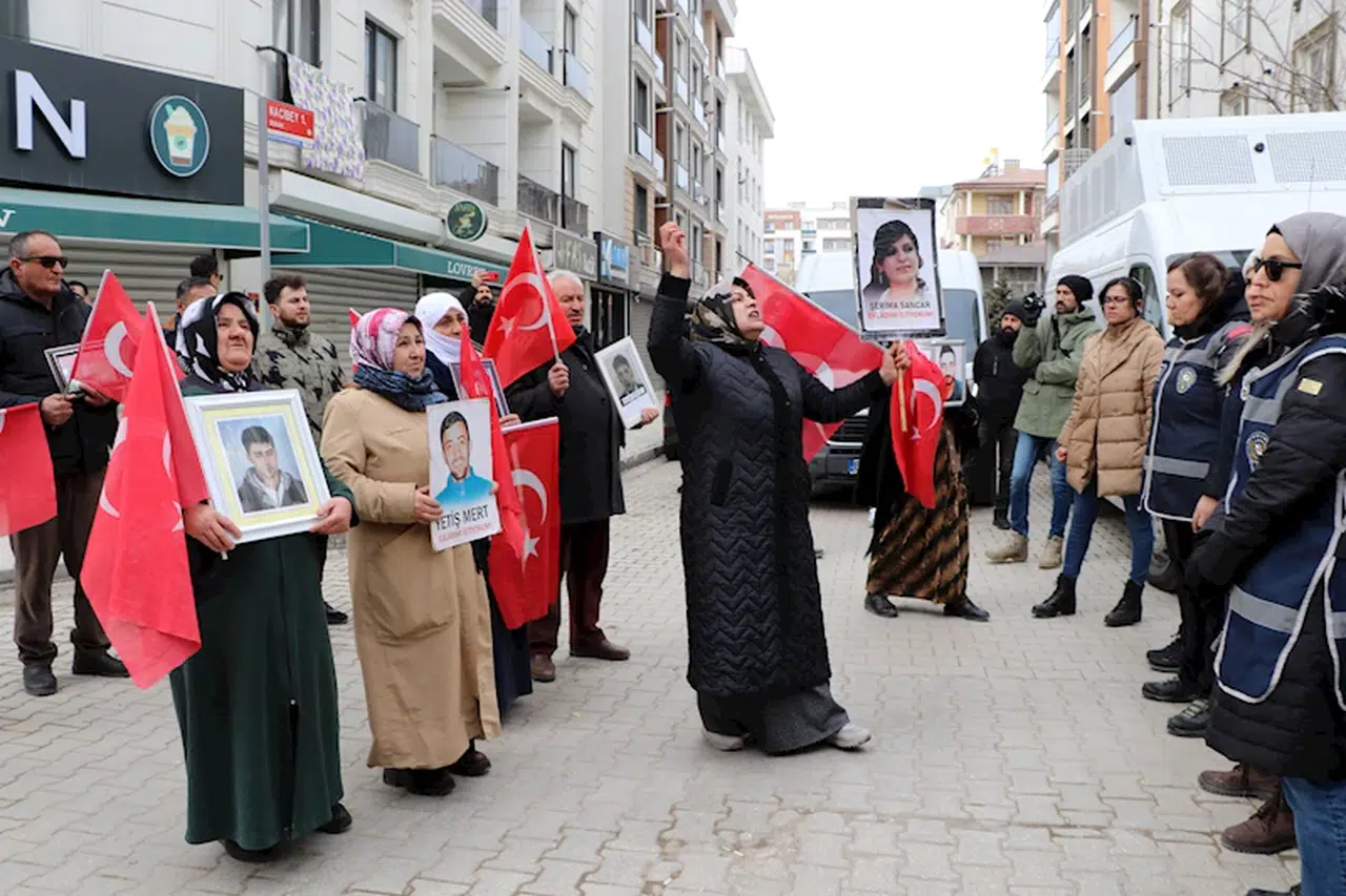 Terör örgütü PKK tarafından çocuklarının kaçırıldığını belirten aileler, 96'ncı haftada da Menekşe Sokak'ta bir araya geldi. Aileler, ellerinde Türk bayrakları ve çocuklarının fotoğraflarıyla DEM Parti il binasına kadar yürüdü. Yürüyüşte polis de güvenlik önlemi aldı. Seslerinin duyulmasını engellemek için DEM Parti'de çalınan yüksek sesli müziğe tepki gösteren aileler, ‘Kahrolsun PKK’, 'Şehitler ölmez, vatan bölünmez' sloganları attı.