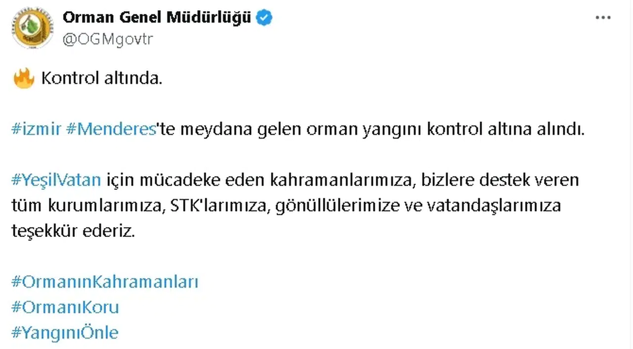 OGM: İzmir Menderes'teki orman yangını kontrol altına alındı