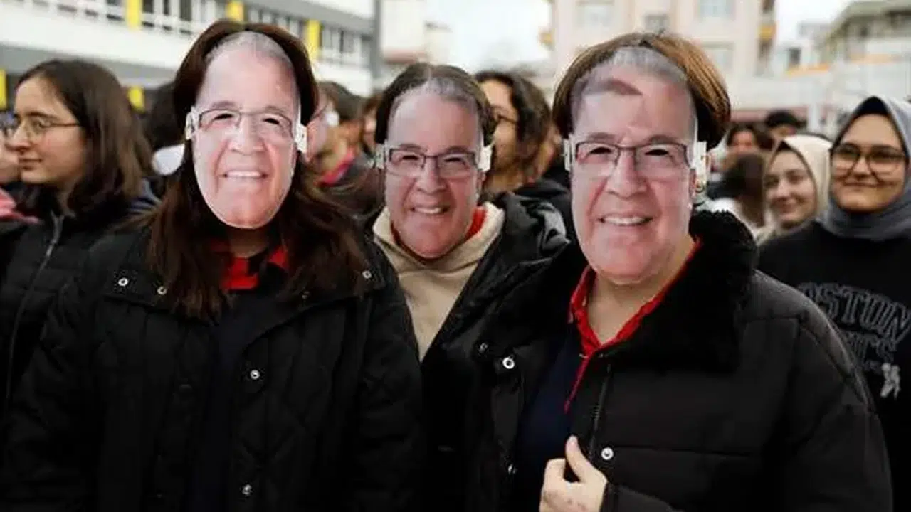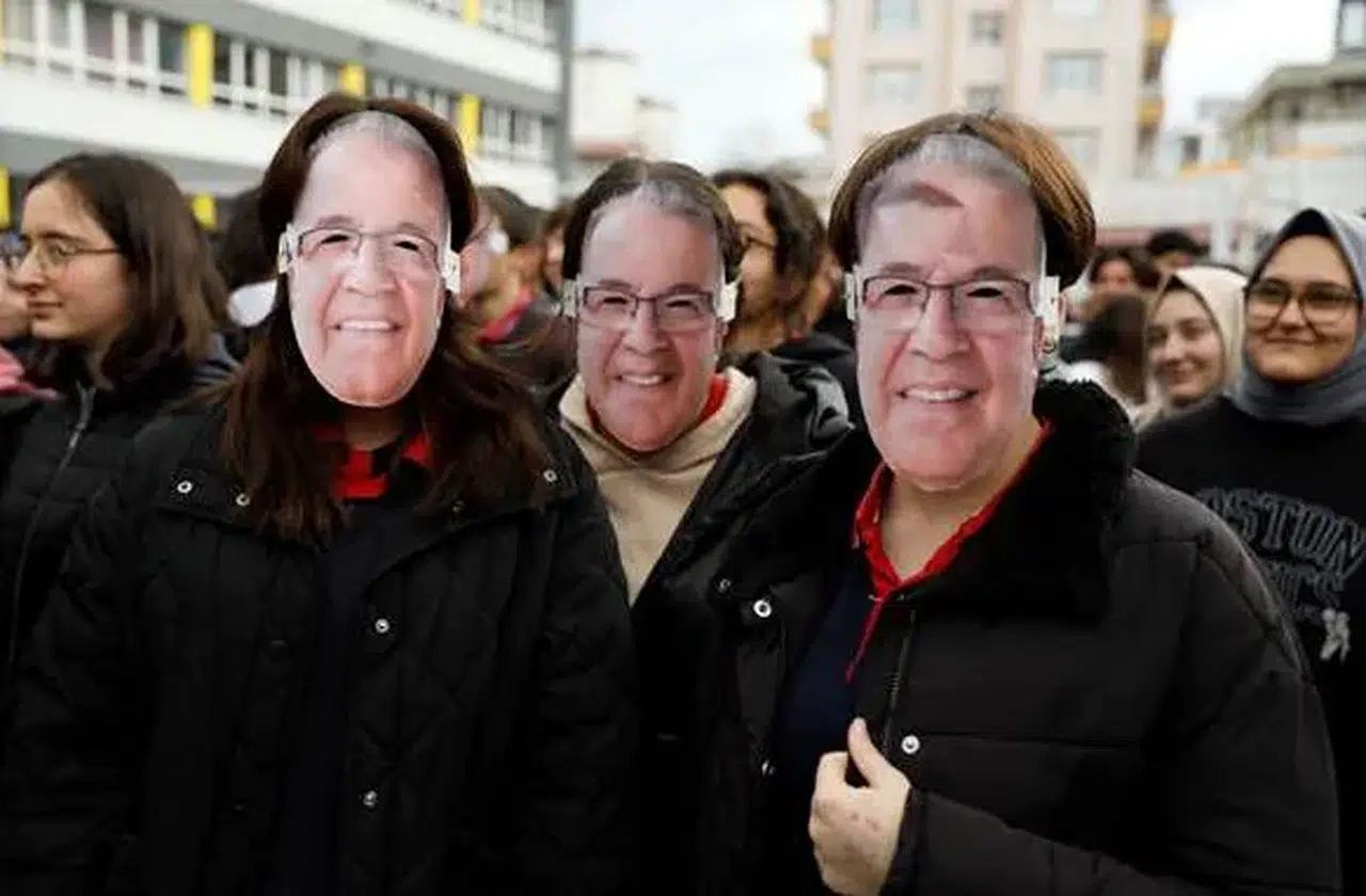 Samsun'un Atakum ilçesinde Cumhuriyet Anadolu Lisesinde 44 yıl görev yapan ve yaş haddinden emekli olan resim öğretmeni İlyas Sağır'ın veda töreninde öğrenciler Sağır'ın fotoğrafının bulunduğu maskeler taktı.