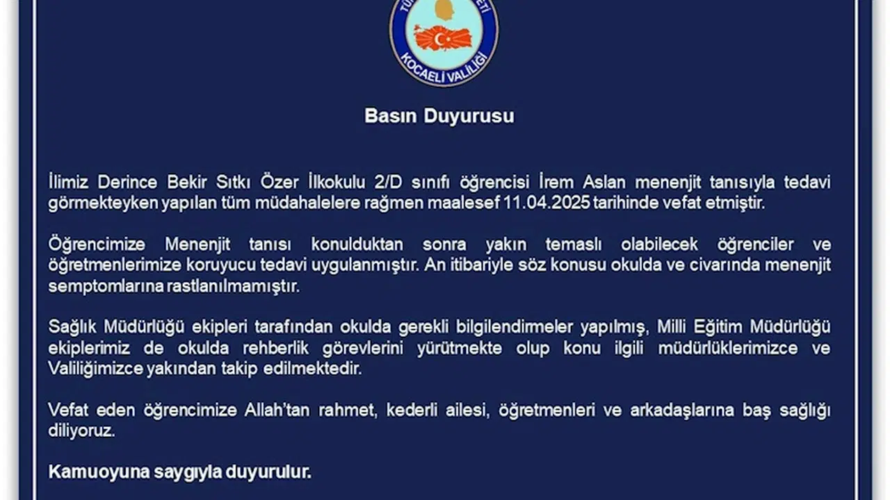 Kocaeli Valiliği, İrem Aslan’ın ölümüne ilişkin yazılı açıklamada yaptı. Açıklamada, Aslan’ın, menenjit tanısıyla tedavi görürken hayatını kaybettiği belirtilerek, “Öğrencimize menenjit tanısı konulduktan sonra yakın temaslı olabilecek öğrenciler ve öğretmenlerimize koruyucu tedavi uygulanmıştır. An itibariyle söz konusu okulda ve civarında menenjit semptomlarına rastlanılmamıştır. Sağlık Müdürlüğü ekipleri tarafından okulda gerekli bilgilendirmeler yapılmış, Milli Eğitim Müdürlüğü ekiplerimiz de okulda rehberlik görevlerini yürütmekte olup konu ilgili müdürlüklerimizce ve valiliğimizce yakından takip edilmektedir. Vefat eden öğrencimize Allah’tan rahmet, kederli ailesi, öğretmenleri ve arkadaşlarına baş sağlığı diliyoruz” ifadelerine yer verildi. (DHA)