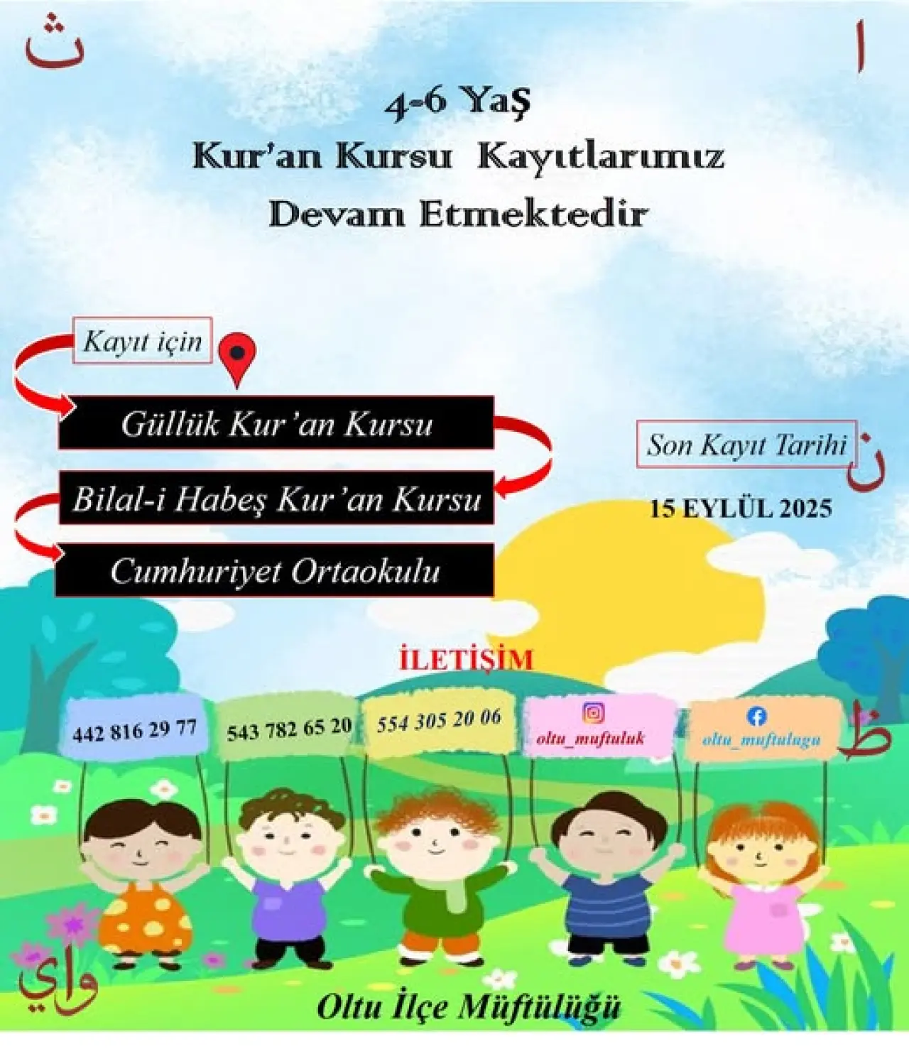 Oltu Müftülüğü tarafından yapılan açıklamada, “Her çocuğumuzun sağlıklı bir dini eğitim alabilmesi için çalışmalarımızı sürdürmekteyiz. İlçemizdeki ihtiyaç odaklı Kur’an kurslarında da kayıtlarımız devam ediyor. Velilerimizi çocuklarını bu kurslarımıza kaydettirmeye davet ediyoruz” ifadelerine yer verildi.