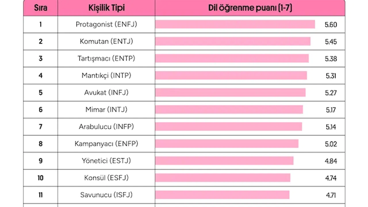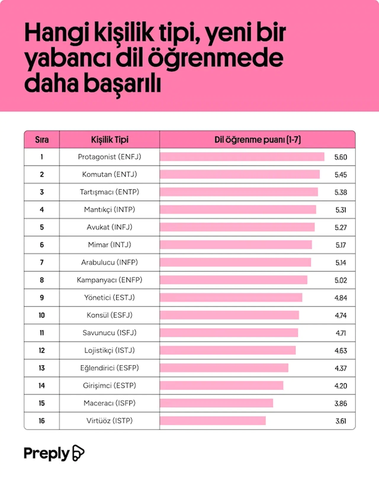 Preply’nin kişilik tiplerinin dil öğrenme süreçlerini etkisini ortaya koyma amacıyla yürütülen araştırmasında, tüm dünyada yaygın olarak kabul edilen, Türkiye’de en az 8 milyon kez çözüldüğü bilinen Myers-Briggs Kişilik Tipi Göstergesi (MBTI) referans alındı. Dört ana kategoride 16 farklı kişilik tipi öneren ve bireyleri içe dönüklük / dışa dönüklük, duyumsama / sezme, düşünme / hissetme ve yargıya varma / algılama tercihleri üzerinden değerlendiren testi çözen bin Preply online İngilizce kursu öğrencisine çeşitli sorular yöneltildi. Anket sonuçları, Protagonist / Önder (ENFJ), Buyurucu / Komutan (ENTJ) ve Tartışmacı (ENTP) kişilik tipine sahip olanların, dil öğrenmede en başarılı olanlar olduğunu gösterdi.