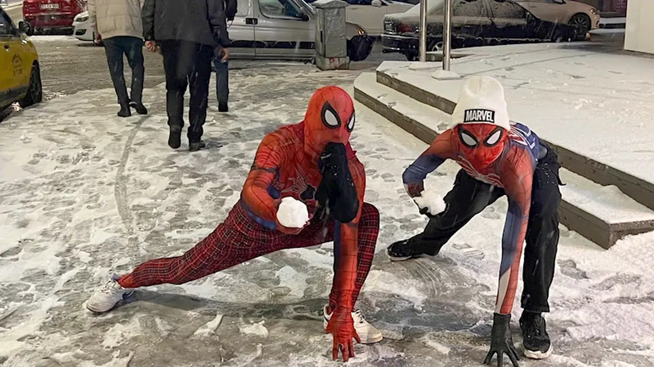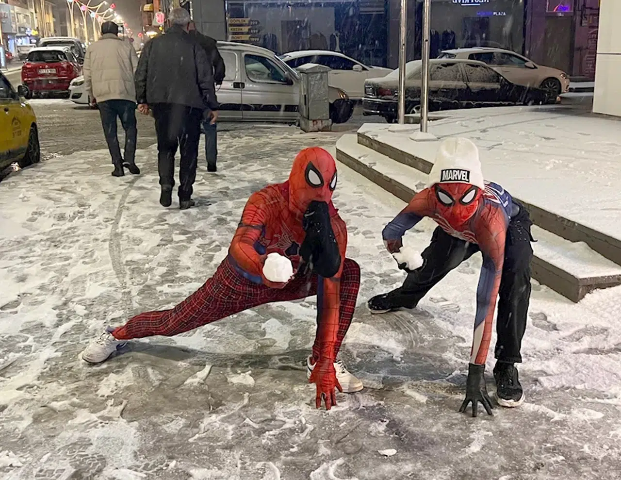 Muzaffer KOŞAN/ERZİNCAN, (DHA)- TÜRKİYE'yi gezme hayaliyle memleketi İzmir'den 'Örümcek Adam' kostümüyle yola çıkan Ayaz Salih Koç (25), 62'nci durağı olan Erzincan'da kendisi gibi 'Örümcek Adam' kostümüyle dolaşan Asaf Özdemir (16) ile karşılaştı. Taraflar kısa süreli şaşkınlığın ardından yağan lapa lapa kar altında kar topu savaşı yaptı, ardından da birbirine sarıldı.
