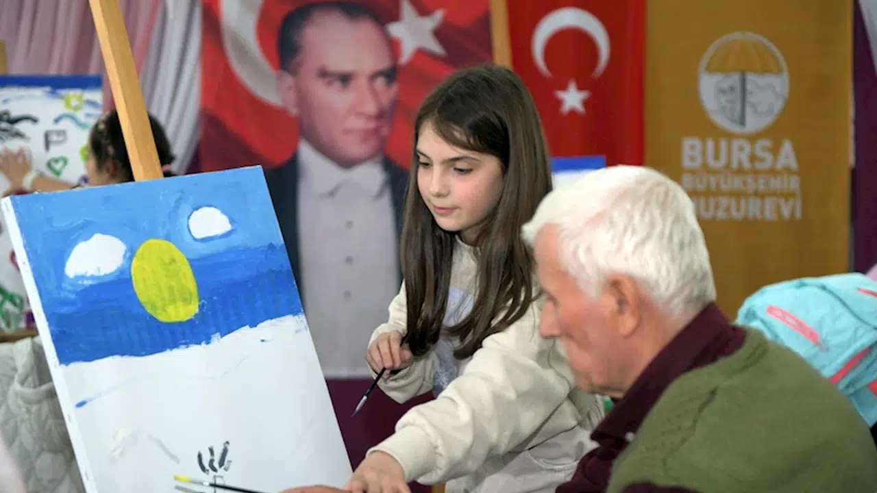 Hasan BOZBEY/ BURSA, (DHA)- BURSA'da, Osmangazi Belediyesi Hüdavendigar Yetenek Evi Resim Sınıfı öğrencileri, 'Yaşlılara Saygı Haftası’ kapsamında huzur evi sakinleriyle bir araya gelerek birlikte resim yaptılar