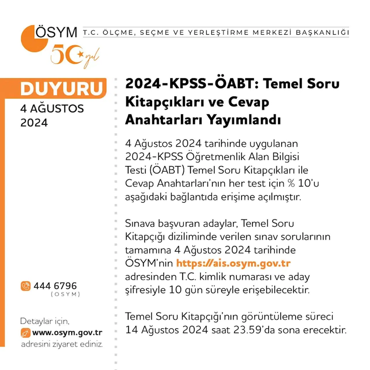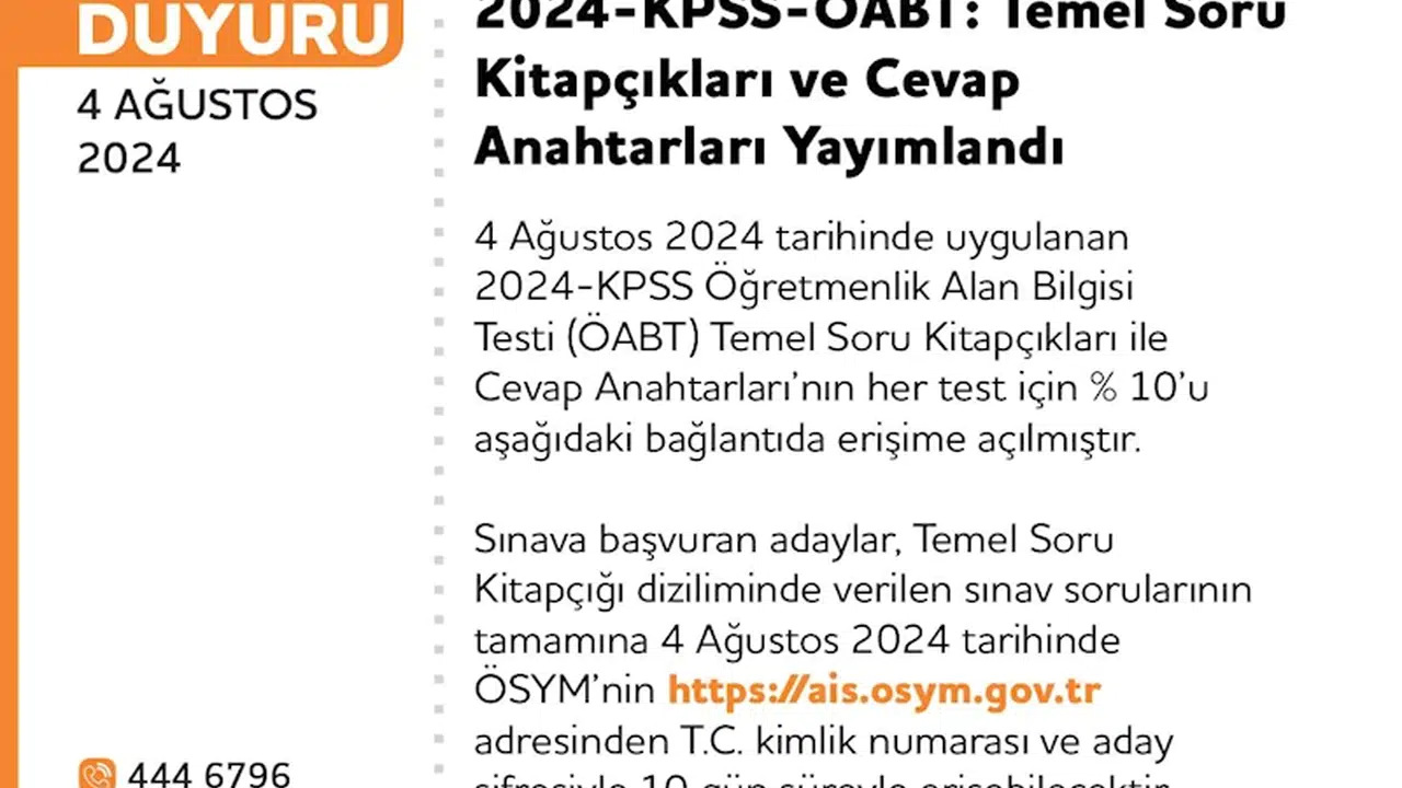 Salih HÜDAVERDİ/ANKARA,(DHA)- ÖĞRENCİ Seçme ve Yerleştirme Merkezi (ÖSYM), 2024-KPSS-ÖABT Temel Soru Kitapçıkları ve Cevap Anahtarları'nın yayımlandığını duyurdu.
