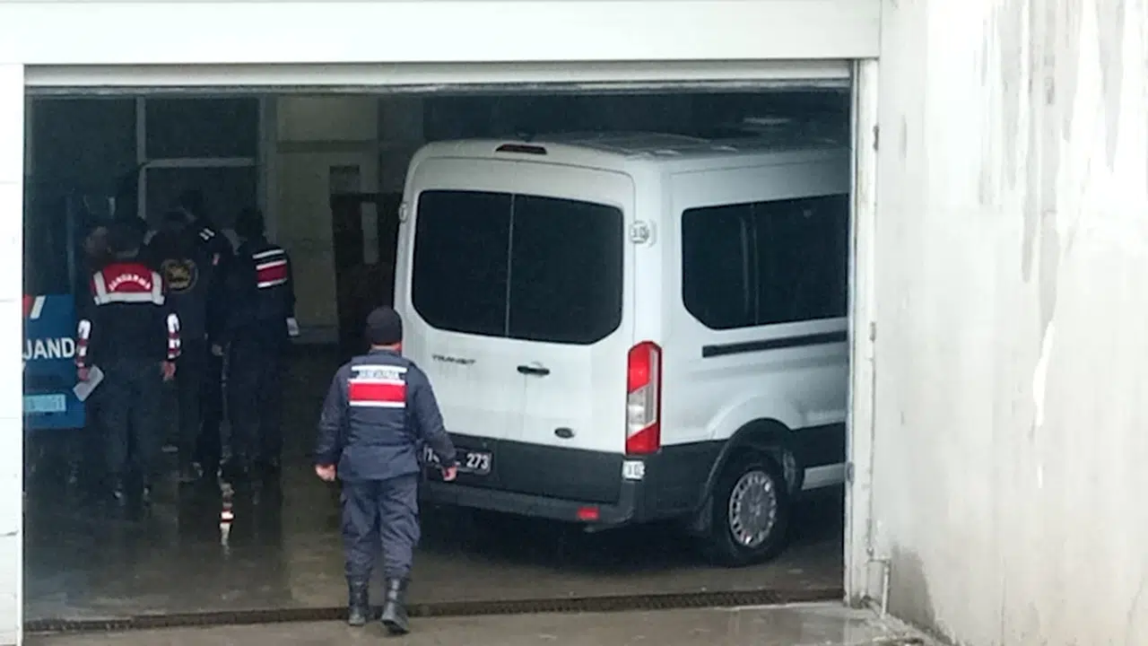 Şüphelilerden 4'ü İl Jandarma Komutanlığı'ndaki işlemlerinin tamamlanmasının ardından adliyeye sevk edildi. Şüpheliler, adliyenin arka kapısındaki otopark girişinden adliyeye alındı. (DHA)