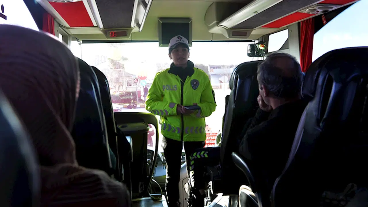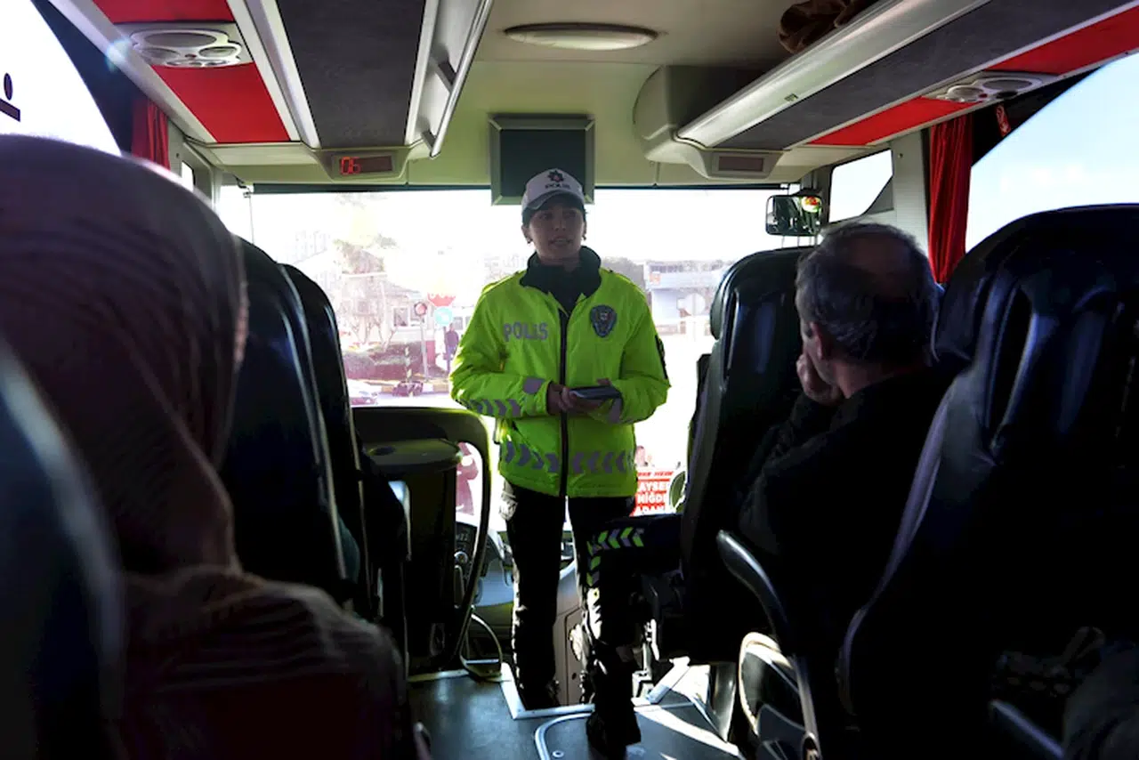 Anıl ATAR-Yaşar SERİNTÜRK/ADANA, (DHA)- ADANA’da trafik polisi, yılbaşı tedbirleri kapsamında otogardaki yolcu otobüslerinde kış lastiği, takograf kontrolü ve alkol denetimi yapıp, sürücü ve yolcuları emniyet kemeri takmaları konusunda uyardı.